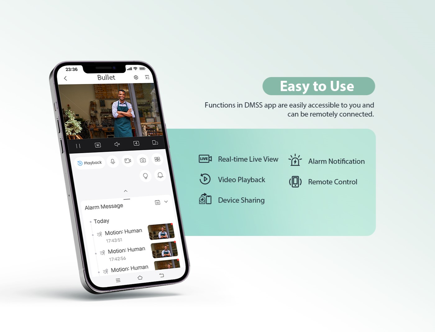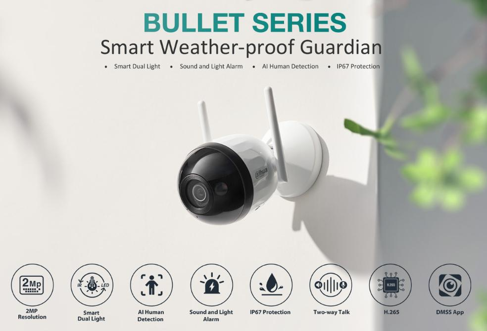 🖐️Dòng Bullet, thuộc dòng Dahua Wireless, là những camera không chỉ dễ cài đặt và vận hành mà còn hoạt động vượt trội và tiết kiệm chi phí. Chúng ghi lại hình ảnh sắc nét, 🖐️chi tiết về các cảnh ở độ phân giải cao và cung cấp các chức năng mạnh mẽ, chẳng hạn như phát hiện con người bằng AI, để kích hoạt cảnh báo một cách chính xác. 🖐️🖐️Thông tin cũng được gửi đồng bộ đến điện thoại của bạn để giúp bạn cập nhật. Với xếp hạng IP67, những camera này có thể chịu được môi trường khắc nghiệt, khiến chúng rất phù hợp để sử dụng trong các môi trường vừa và nhỏ như các cửa hàng bán lẻ quy mô nhỏ.