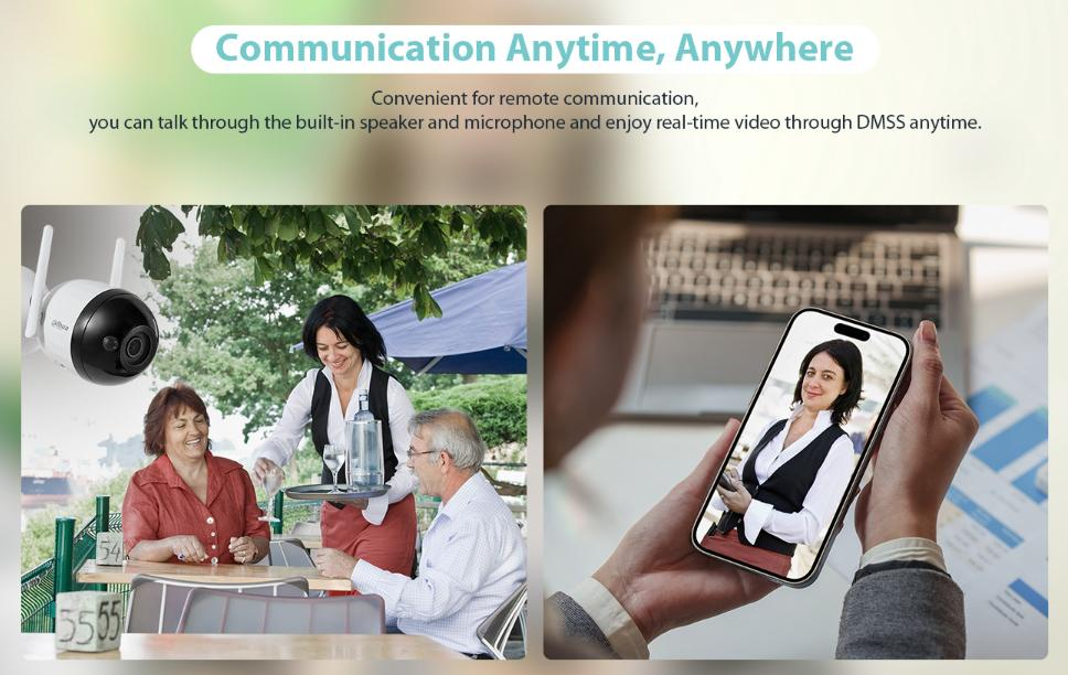 🖐️Thuận tiện cho việc liên lạc từ xa, bạn có thể nói chuyện qua loa và micrô tích hợp cũng như thưởng thức video thời gian thực thông qua DMSS bất cứ lúc nào.