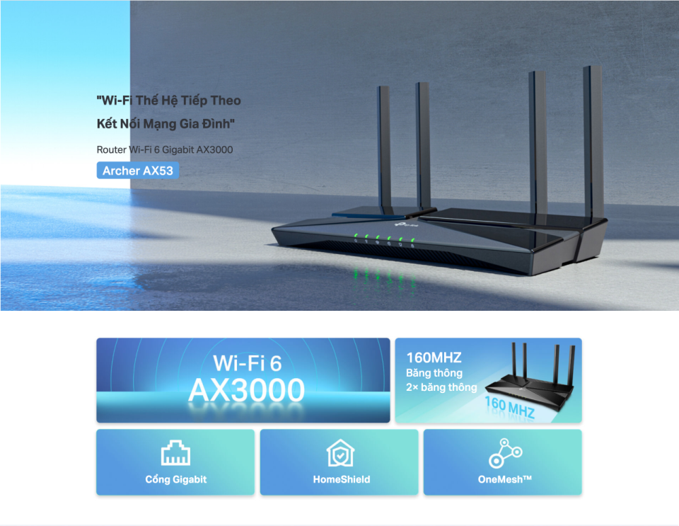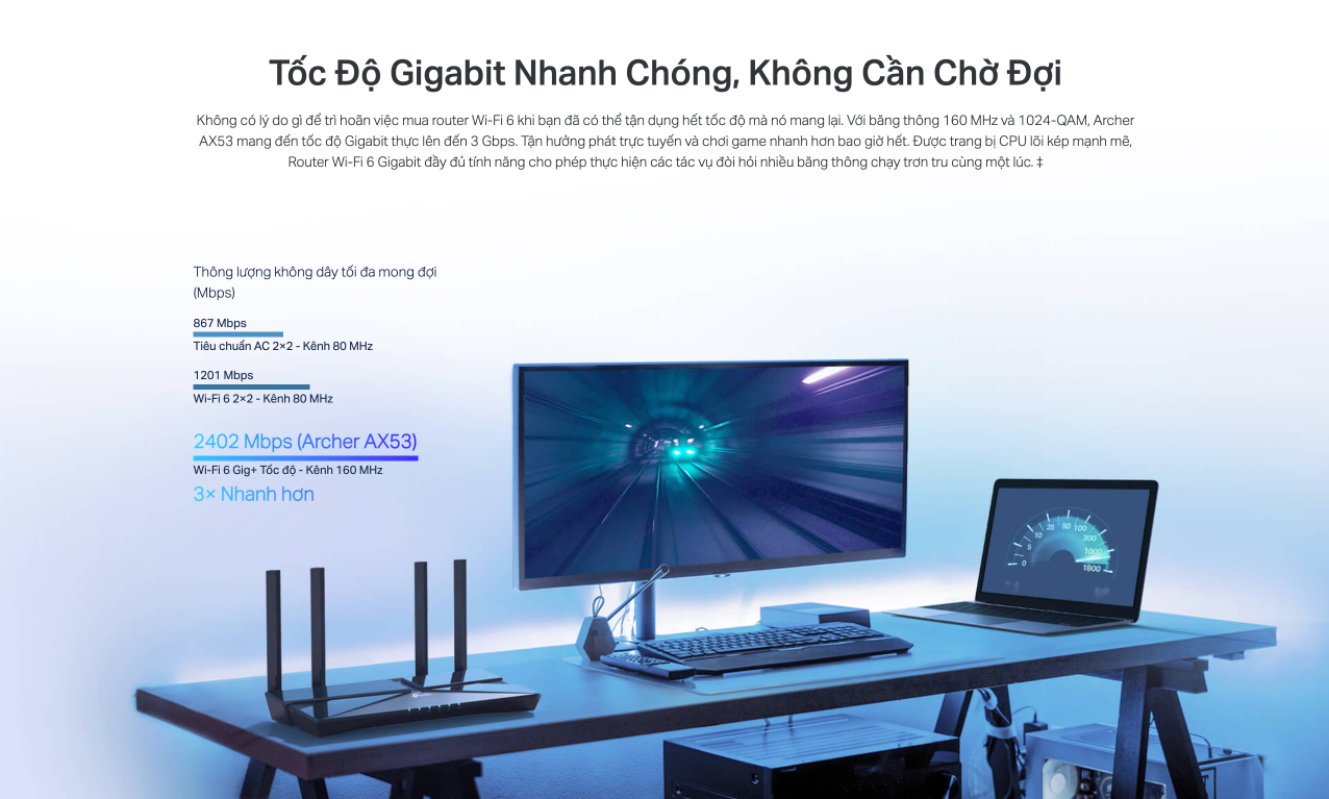 👉 Tp-Link AX53 Wi-Fi 6 Gigabit thế hệ tiếp theo tốc độ — 2402 Mbps trên băng tần 5 GHz và 574 Mbps trên băng tần 2.4 GHz đảm bảo truyền trực tuyến mượt mà hơn và tải xuống nhanh hơn.