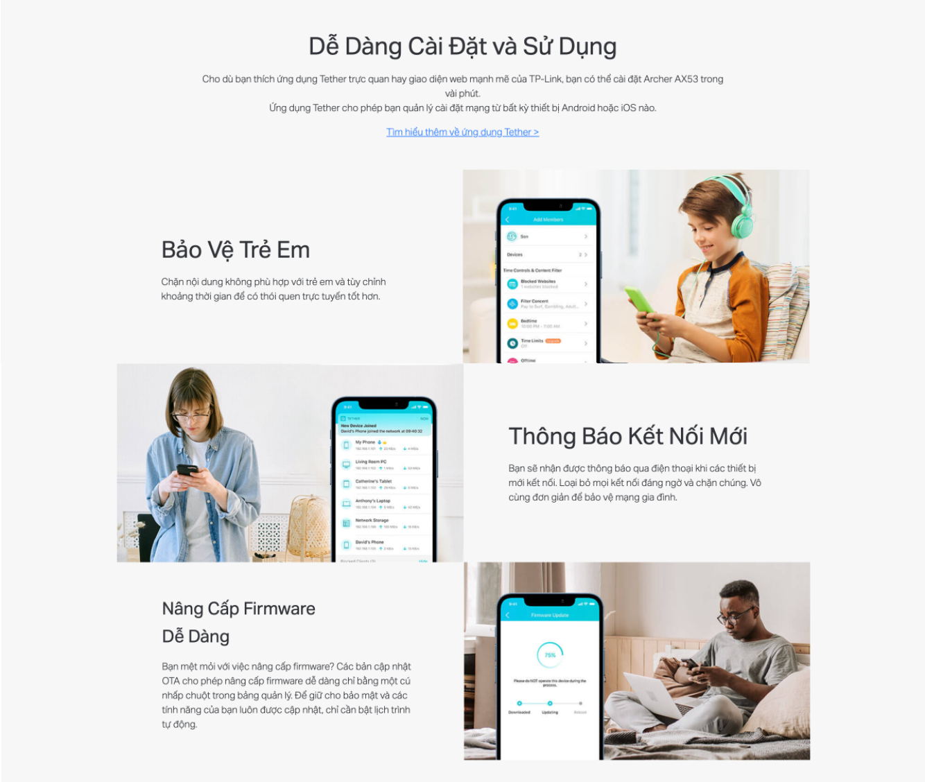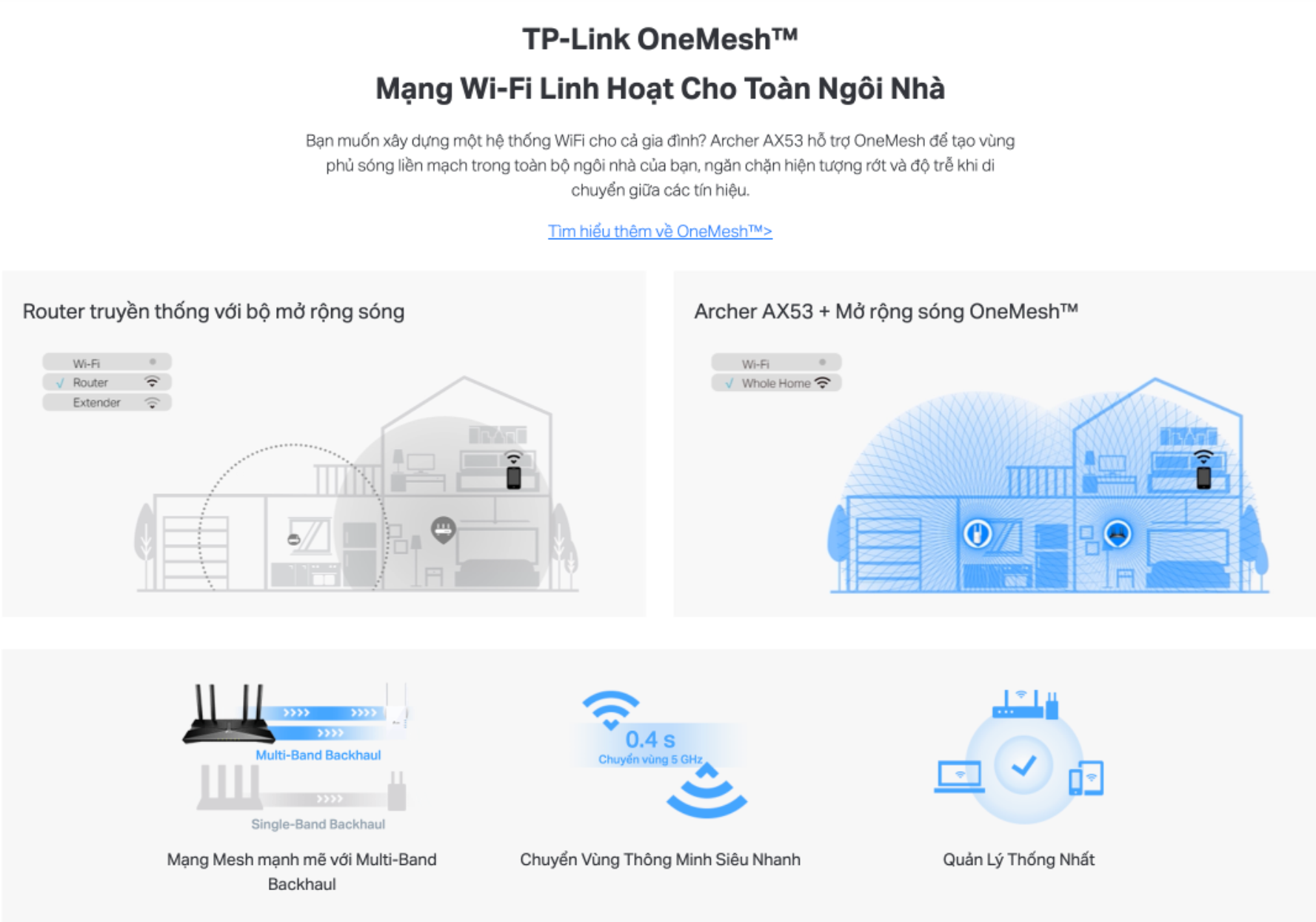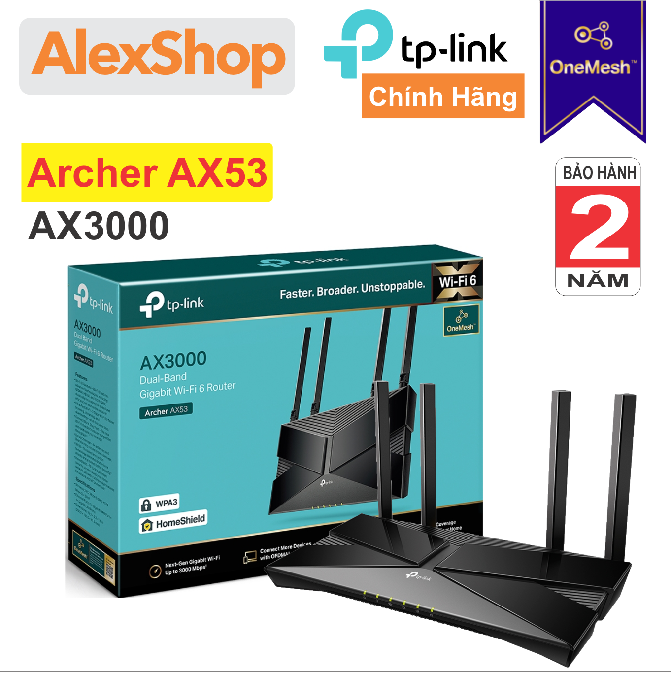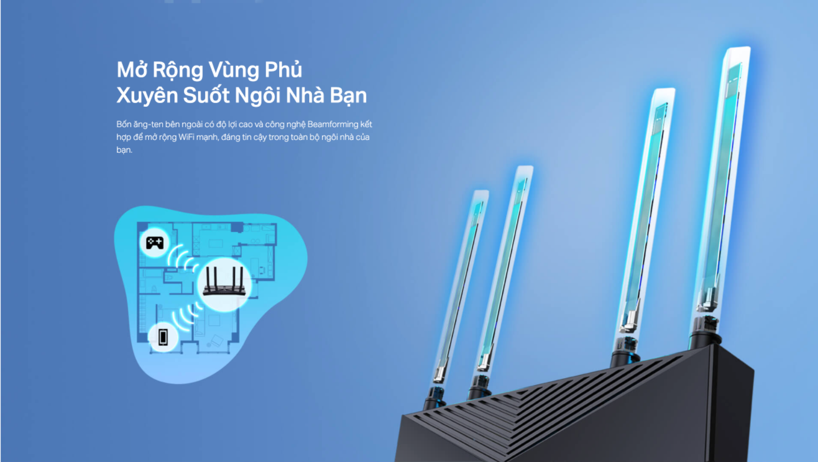 👉 Phạm vi phủ sóng Wi-Fi mở rộng — Tp-Link AX53 Bốn ăng-ten bên ngoài có độ lợi cao và công nghệ Beamforming kết hợp với nhau để mở rộng Wi-Fi mạnh mẽ, đáng tin cậy trong toàn bộ ngôi nhà của bạn.
