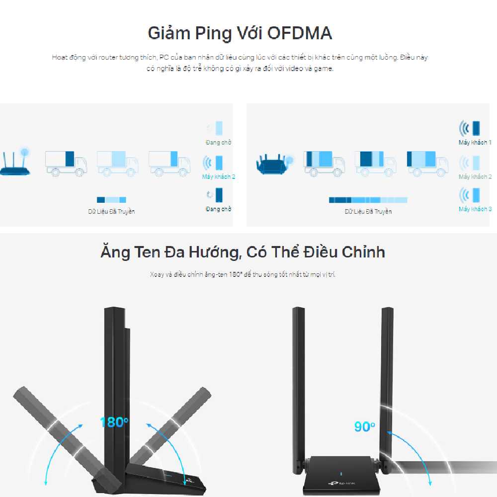 - Tốc Độ Wi-Fi 6 Siêu Nhanh – Truyền phát video hoàn hảo với tốc độ không dây 1800 Mbps (1201 Mbps trên 5 GHz + 574 Mbps trên 2.4 GHz)