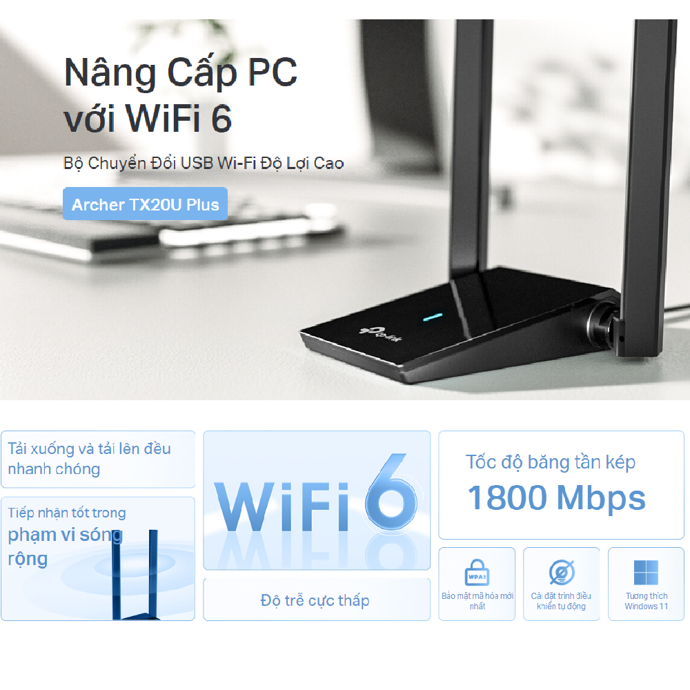 Hãy quên việc mua một chiếc PC mới. TX20U Plus cung cấp WiFi 6 băng tần kép mạnh mẽ đến từng thiết bị của bạn để có kết nối vượt trội và tốc độ lên đến 1800 Mbps.