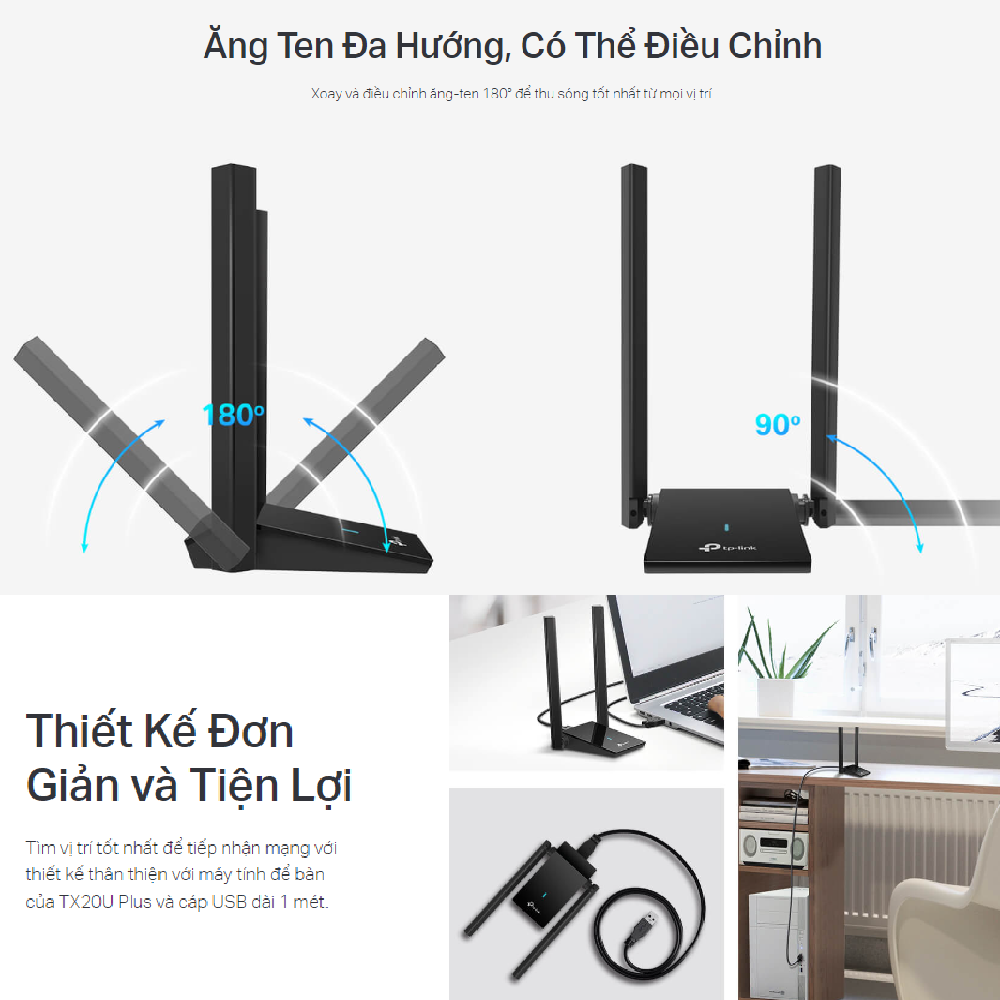 Tìm vị trí tốt nhất để tiếp nhận mạng với thiết kế thân thiện với máy tính để bàn của TX20U Plus và cáp USB dài 1 mét.
