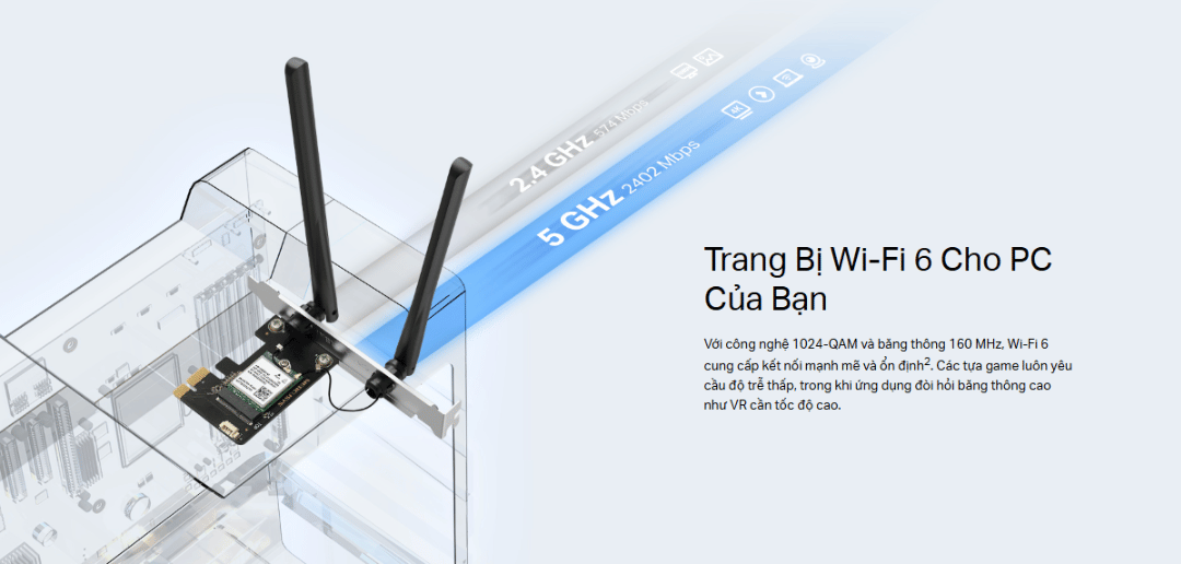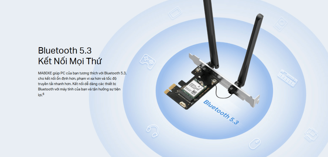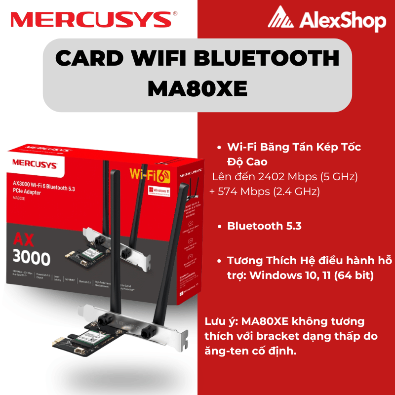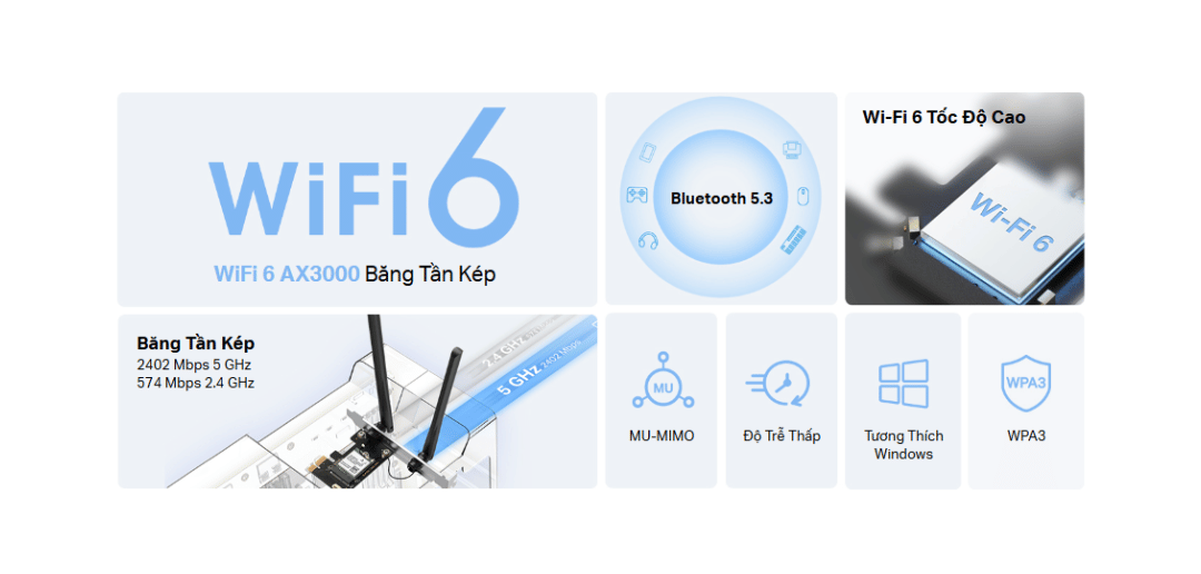Tăng cường kết nối của bạn với Adapter PCIe AX3000 Wi-Fi 6 Bluetooth 5.3, mang đến hiệu suất vượt trội và sự ổn định cho các thiết bị của bạn.