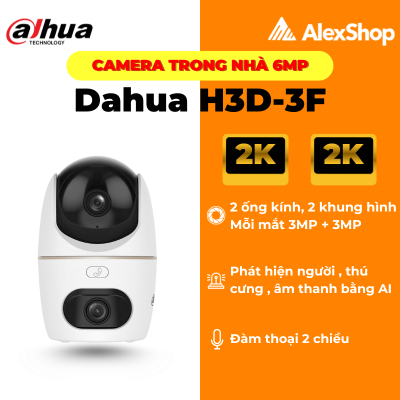 Camera DH-H3D-3F với 2 ống kính (cố định & quay quét) mang đến hình ảnh sắc nét 3MP (2304×1296), tích hợp tính năng thông minh, phù hợp cho gia đình, cửa hàng, văn phòng.