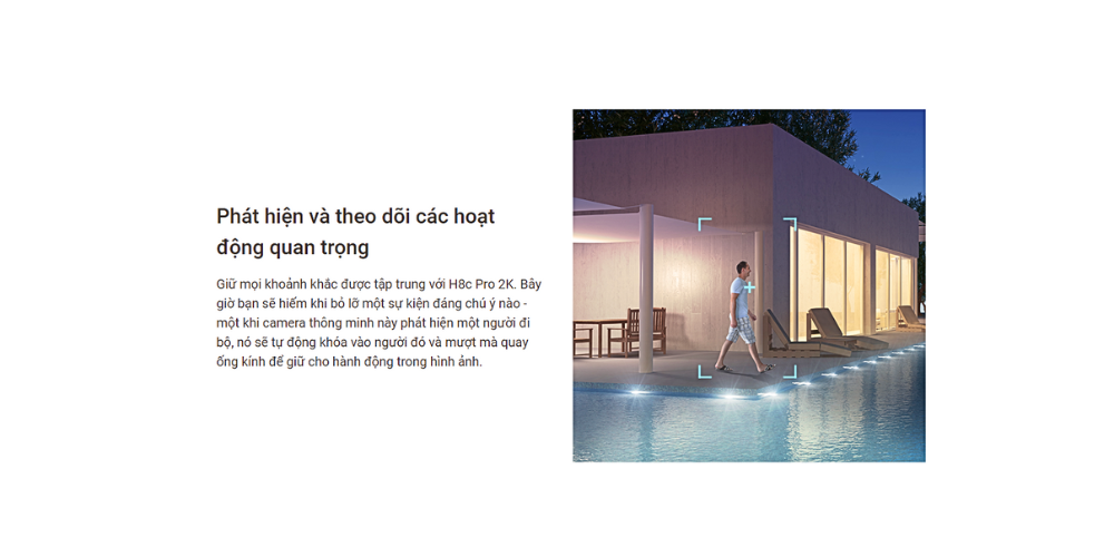 Với khả năng theo dõi thông minh của mình, H8c Pro 2K đảm bảo rằng không có sự kiện dễ dàng biến mất từ góc nhìn camera tĩnh. Một khi xác định hành động của con người, nó tự động quay và phóng to để ghi lại hoạt động đang diễn ra với một bản ghi video hoàn chỉnh.