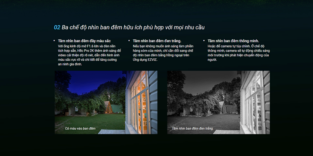 Tăng cường an ninh ngoài trời với EZVIZ H8C Pro 2K, cung cấp hình ảnh giám sát 360 độ, với độ phân giải 3 megapixel đảm bảo không bỏ sót chi tiết nào từ ngày sang đêm. Nhờ tính năng theo dõi phóng to tự động tiên tiến của nó, camera Wifi H8c Pro 2K với chức năng quay quét sẽ chụp toàn bộ hoạt động của một người hoặc một chiếc xe di chuyển xung quanh nhà của bạn, và phản ứng cảnh báo qua âm thanh tại chỗ nếu có sự xâm nhập trái phép.