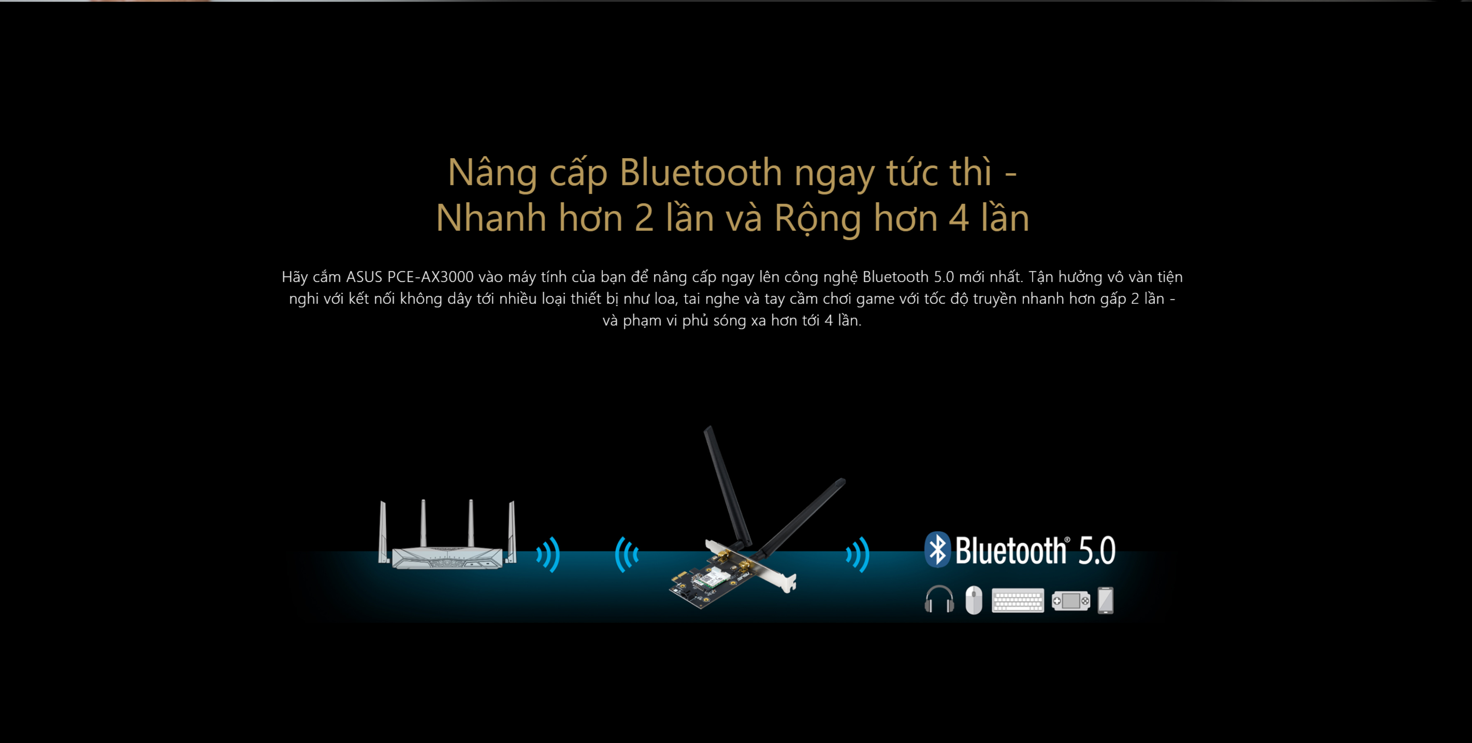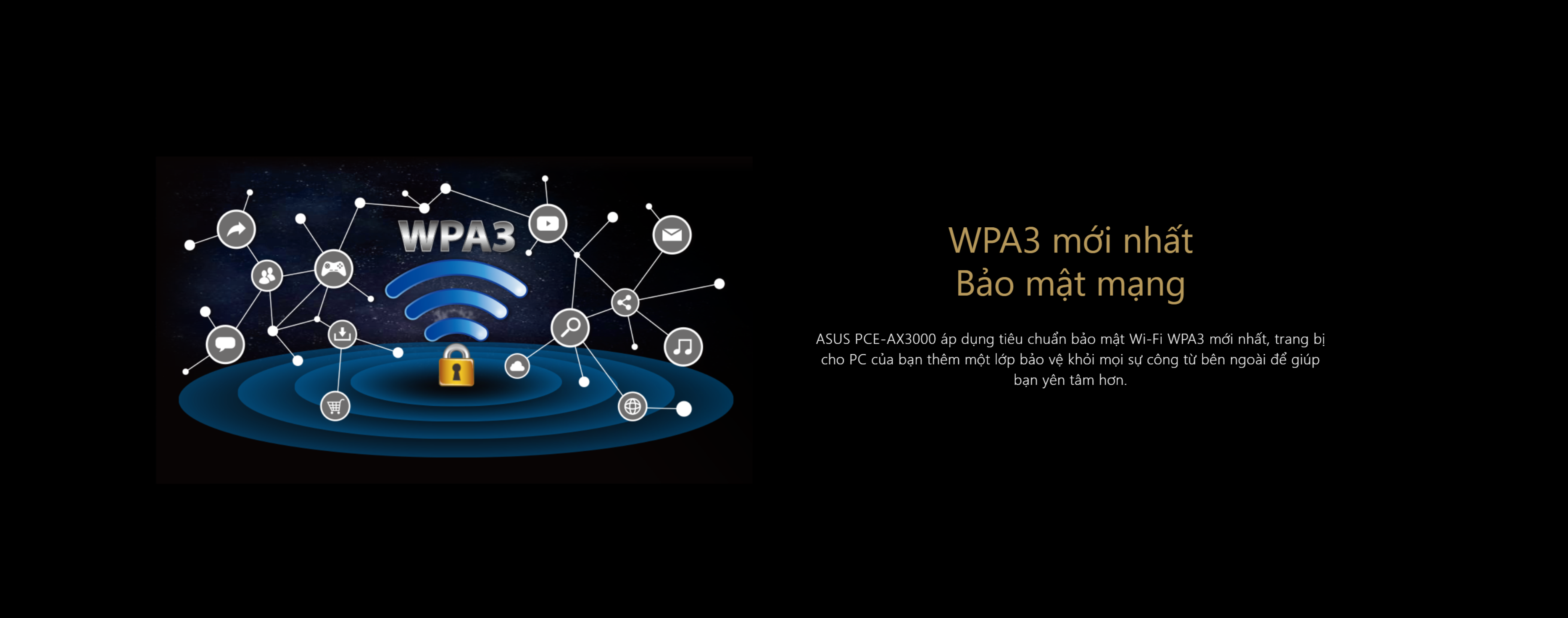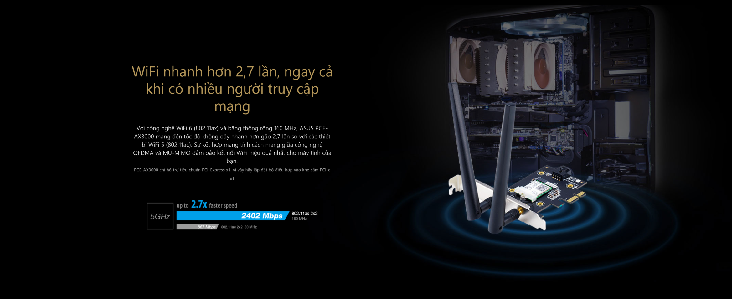 PCI-E AX3000 WiFi 6 (802.11ax) băng tần kép. Hỗ trợ 160 MHz, Bluetooth 5.0, bảo mật mạng WPA3, OFDMA và MU-MIMO
