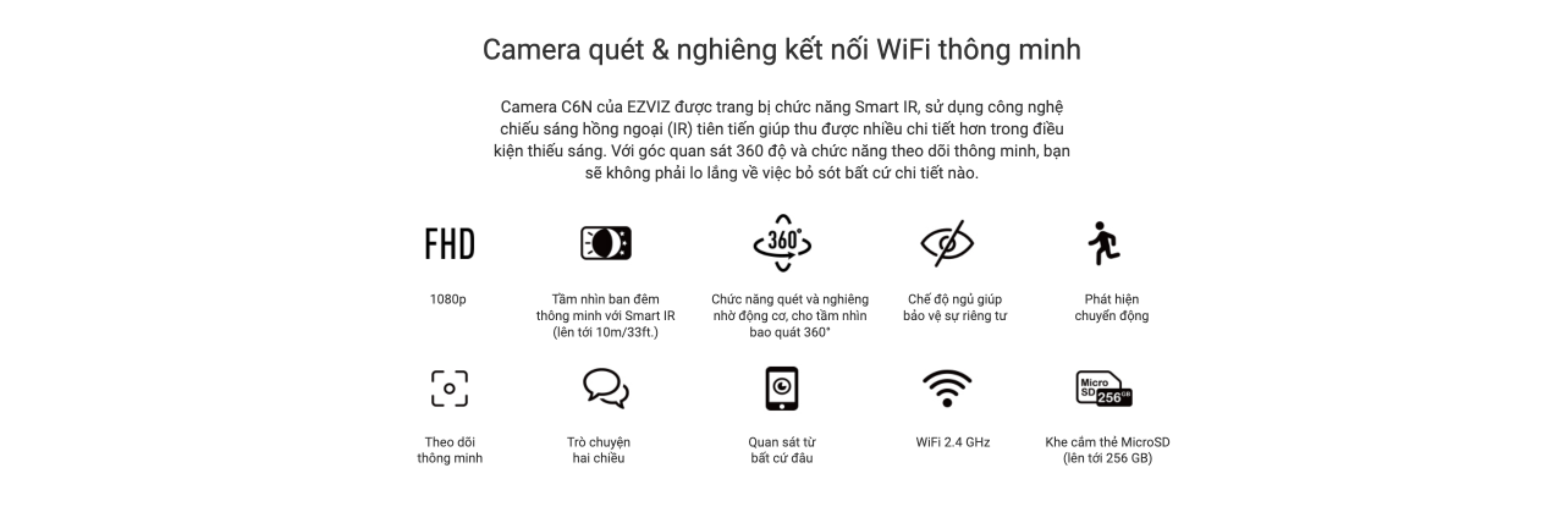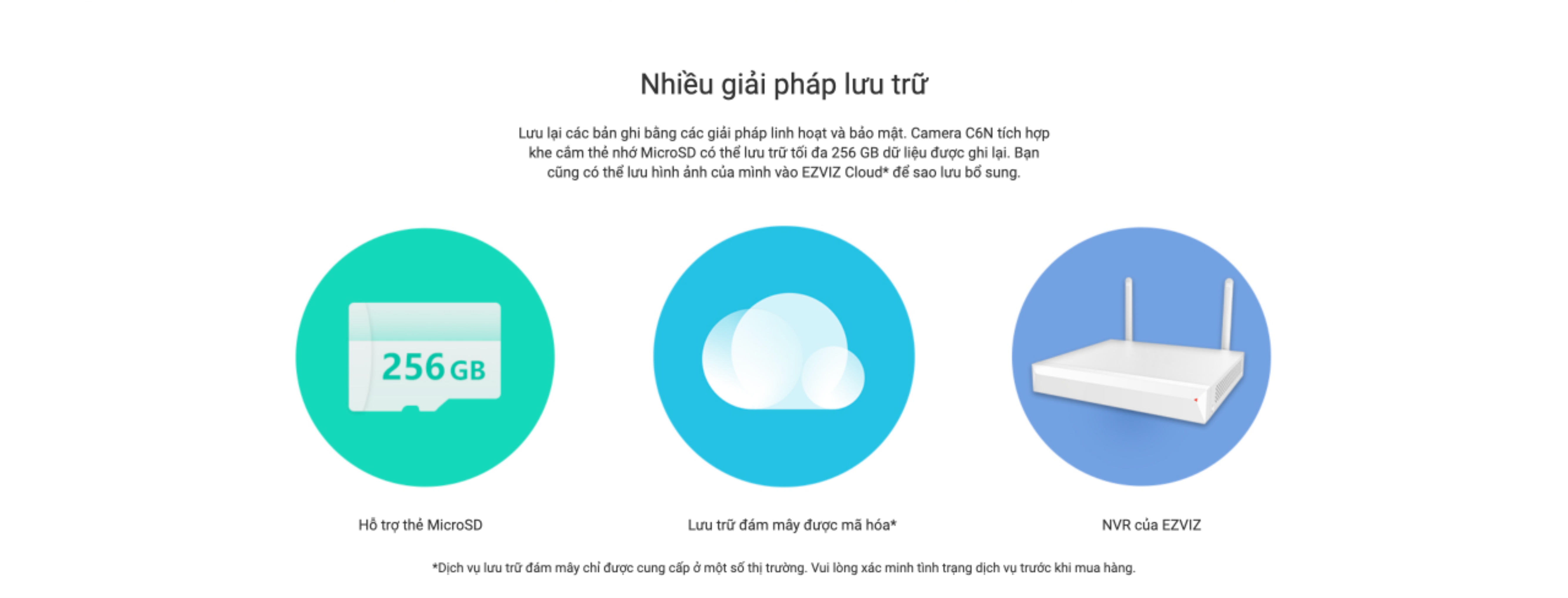⭐ Nhiều giải pháp lưu trữ: Lưu lại các bản ghi bằng các giải pháp linh hoạt và bảo mật. Camera C6N tích hợp khe cắm thẻ nhớ MicroSD có thể lưu trữ tối đa 256 GB dữ liệu được ghi lại. Bạn cũng có thể lưu hình ảnh của mình vào EZVIZ Cloud* để sao lưu bổ sung.