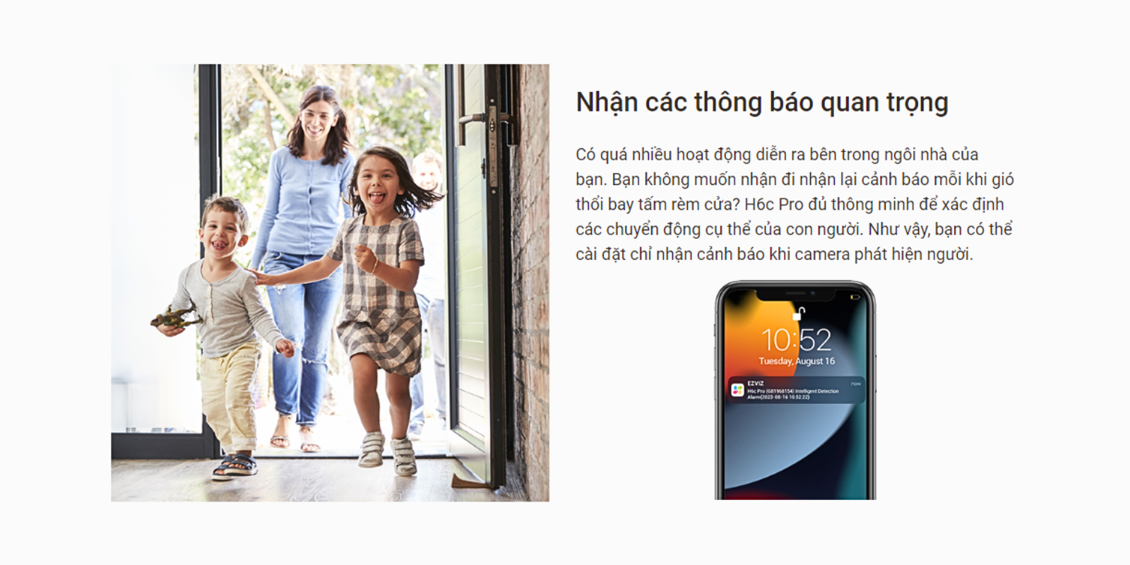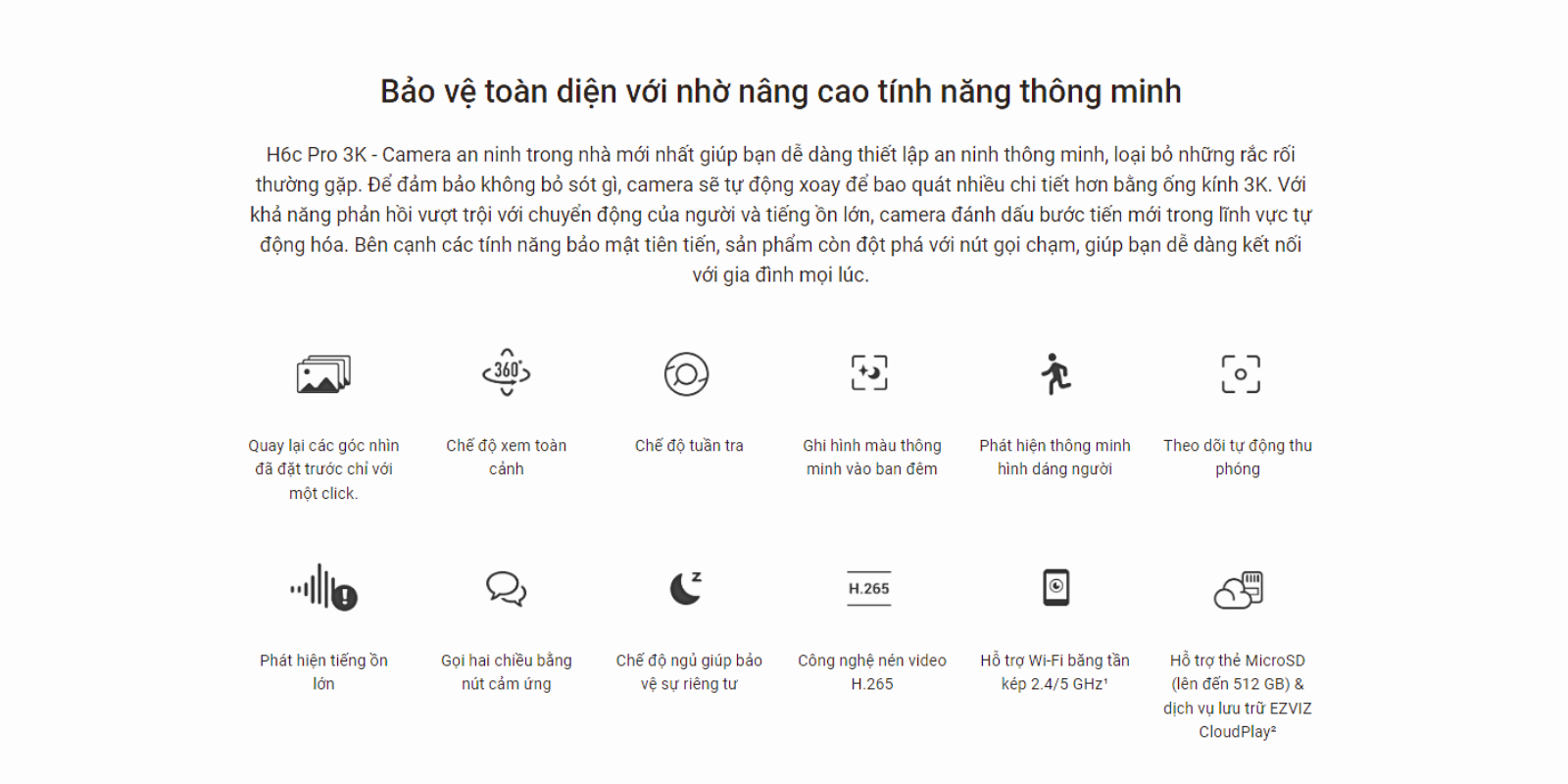 | Báo động thông minh | Phát hiện chuyển động, Phát hiện hình dạng con người, Phát hiện tiếng ồn lớn, Phát hiện chế độ tuần tra |