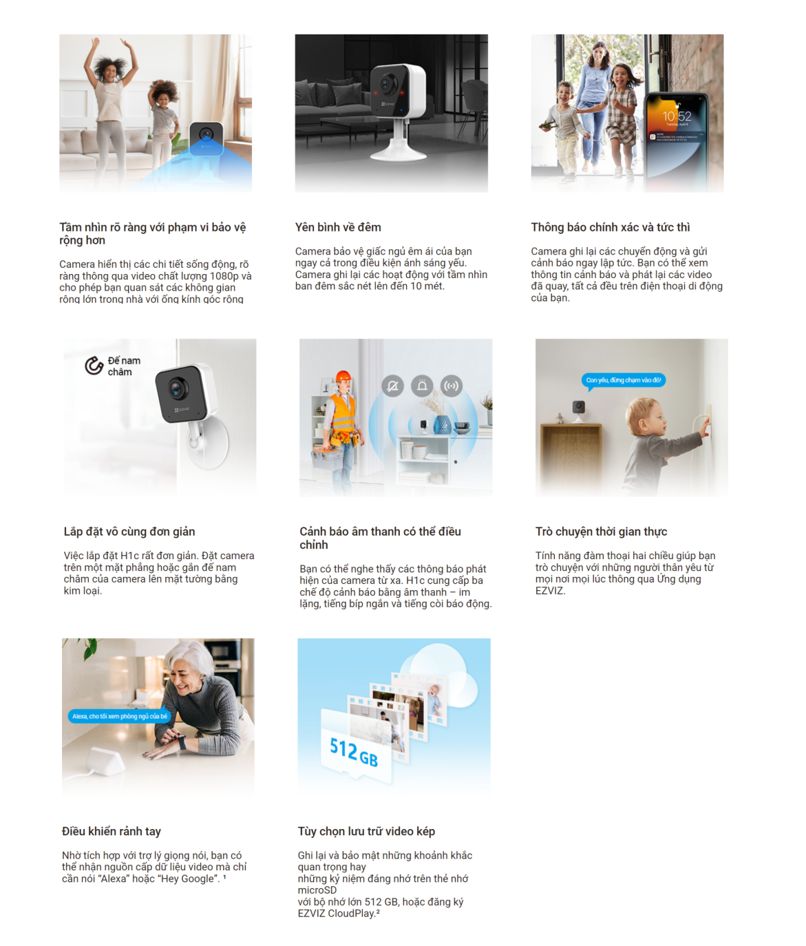 👉 Bảo vệ ngôi nhà bạn thật an toàn: Ezviz H1C là camera Wi-Fi nhỏ gọn của EZVIZ giúp ghi lại những khoảnh khắc sống động, bảo vệ gia đình bạn và luôn cho bạn biết mọi thứ đang diễn ra trong nhà khi bạn đi vắng. Camera đủ nhỏ để đặt được ở gần như mọi nơi và có thiết kế lắp đặt đơn giản có thể tự lắp đặt dễ dàng để đạt hiệu quả tốt nhất có thể.