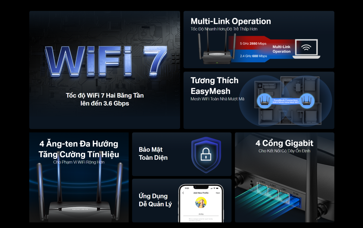 | Quy cách đóng gói | • BE3600 Dual Band Wi-Fi 7 Router MR27BE • Power Adapter • Quick Installation Guide • RJ45 Ethernet Cable |
