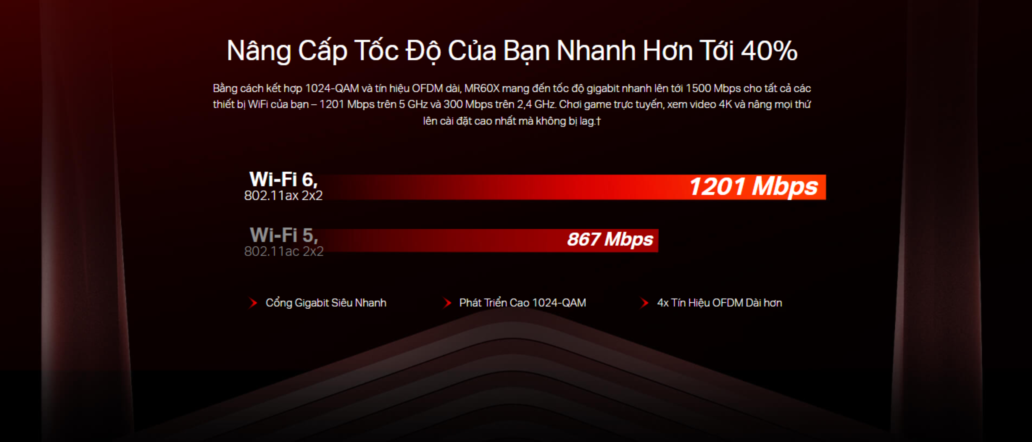 Bằng cách kết hợp 1024-QAM và tín hiệu OFDM dài, MR60X mang đến tốc độ gigabit nhanh lên tới 1500 Mbps cho tất cả các thiết bị WiFi của bạn – 1201 Mbps trên 5 GHz và 300 Mbps trên 2,4 GHz. Chơi game trực tuyến, xem video 4K và nâng mọi thứ lên cài đặt cao nhất mà không bị lag.†