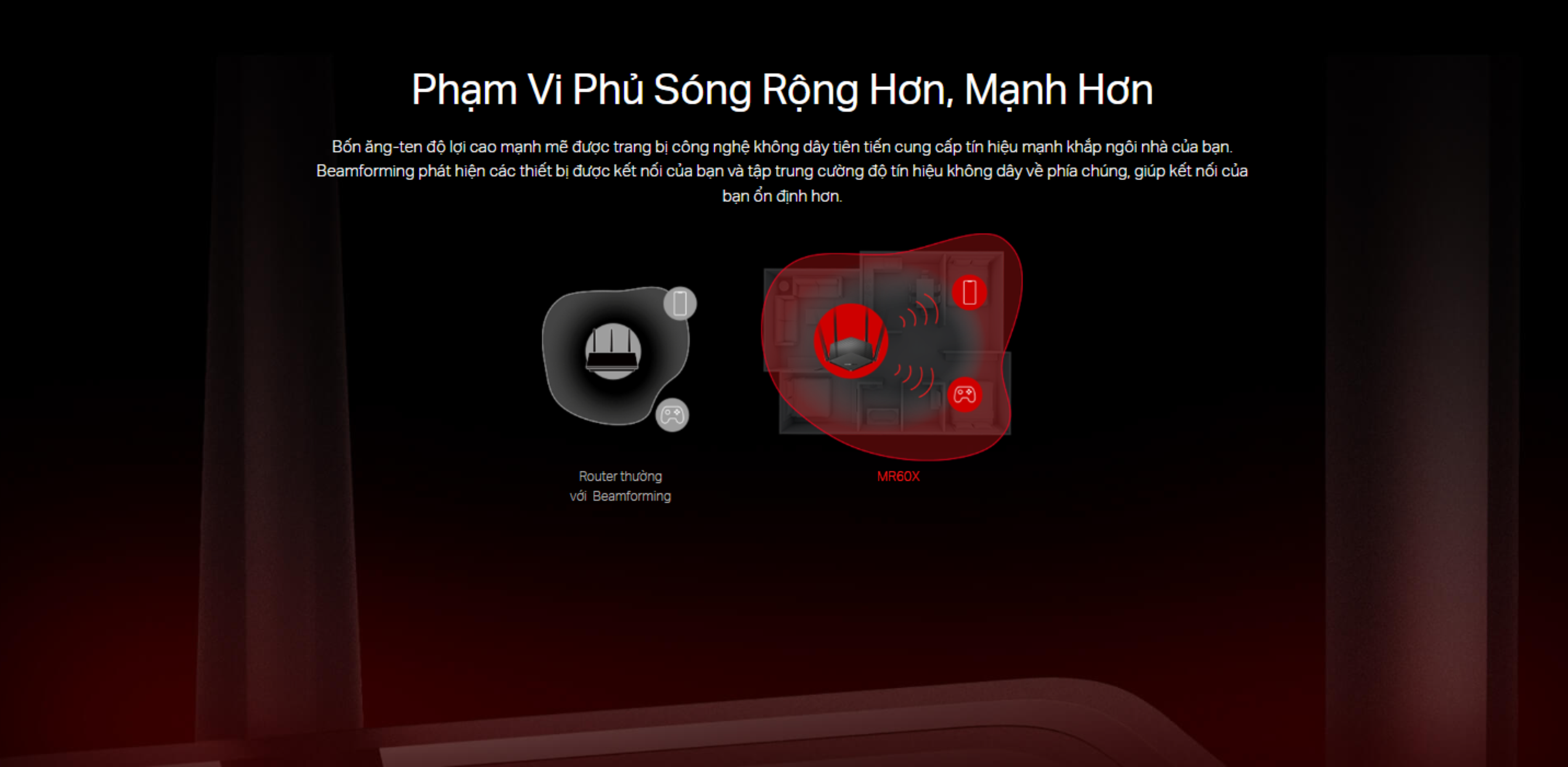 Bốn ăng-ten độ lợi cao mạnh mẽ được trang bị công nghệ không dây tiên tiến cung cấp tín hiệu mạnh khắp ngôi nhà của bạn. Beamforming phát hiện các thiết bị được kết nối của bạn và tập trung cường độ tín hiệu không dây về phía chúng, giúp kết nối của bạn ổn định hơn.