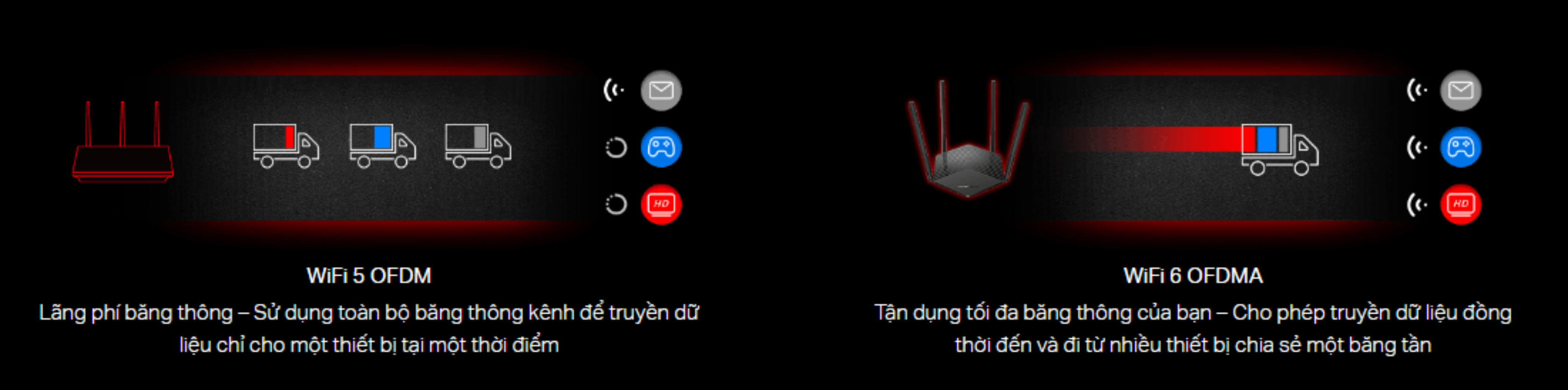 - Dung Lượng Mạng Được Cải Thiện– OFDMA và MU-MIMO cho phép truyền dữ liệu đồng thời đến và đi từ một số thiết bị, cải thiện hiệu suất mạng tổng thể