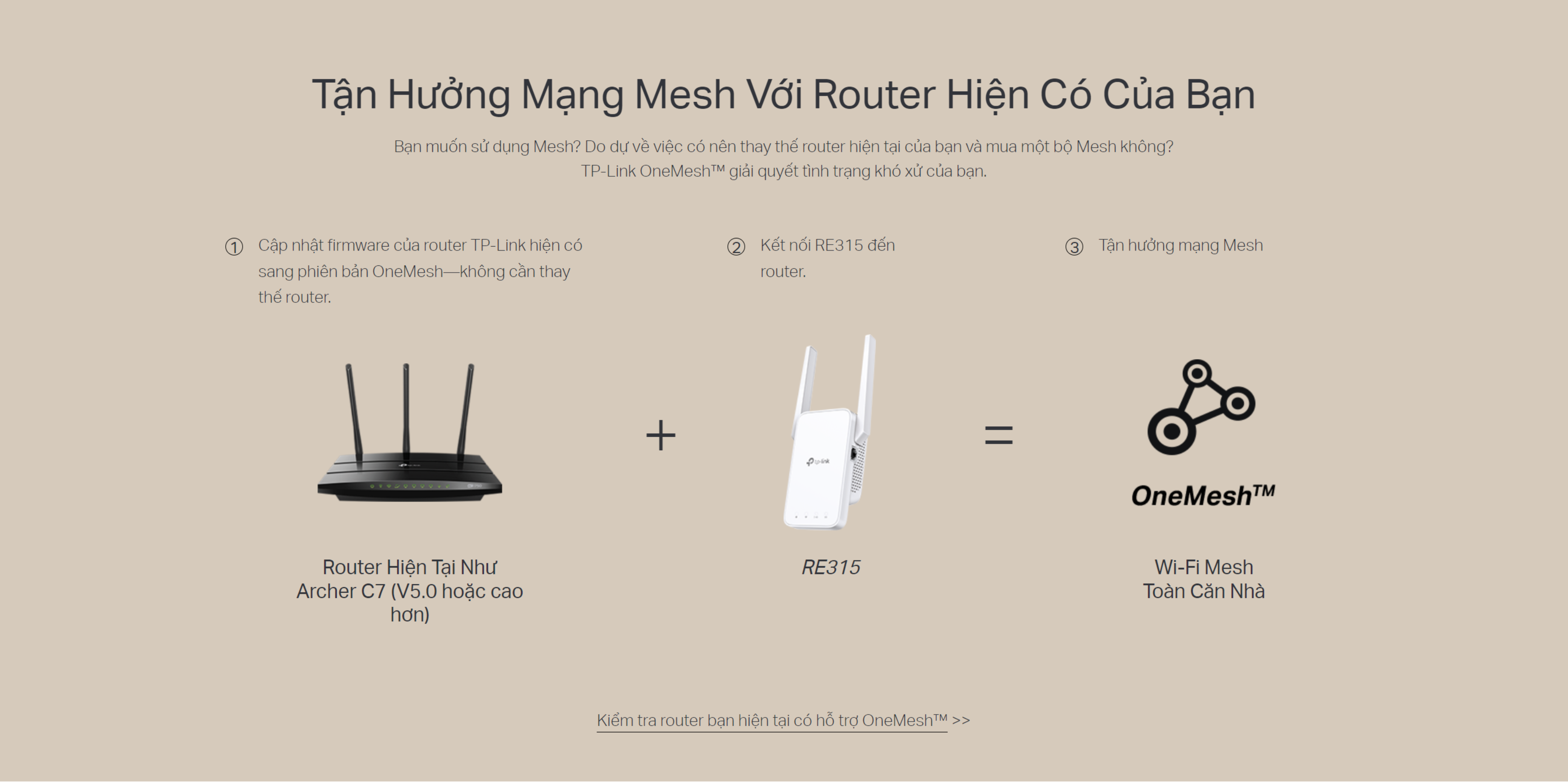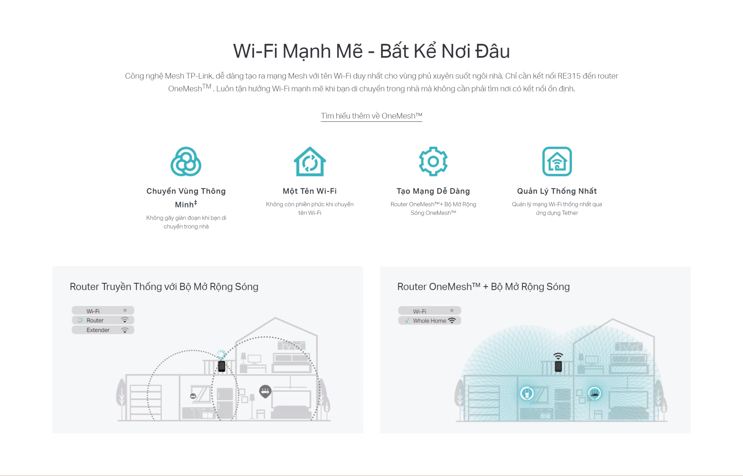 - Tạo mạng Mesh bằng cách kết nối đến router TP-Link OneMesh™ cho vùng phủ liền mạch xuyên suốt nhà bạn.