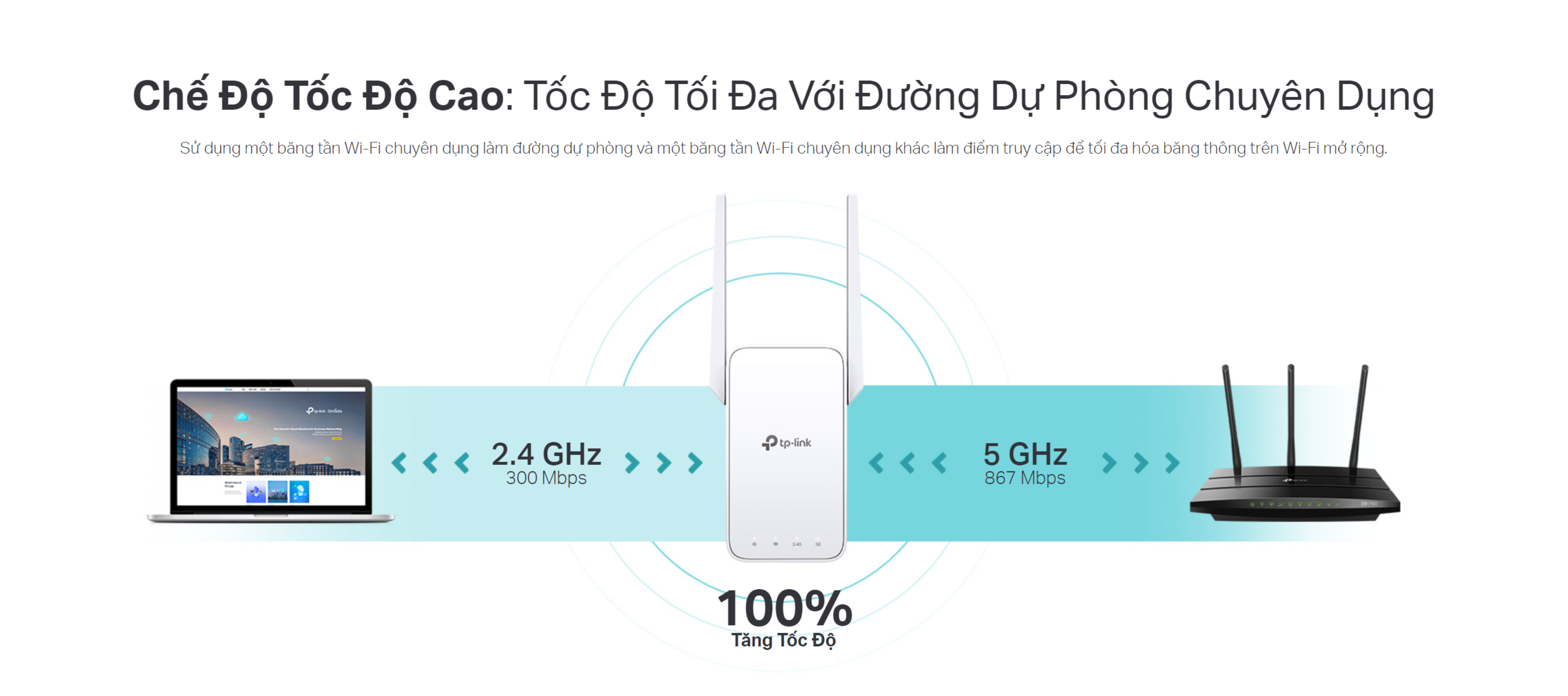 - Chế độ tốc độ cao – tối đa hóa tốc độ bằng cách sử dụng một băng tần Wi-Fi làm công cụ hỗ trợ chuyên dụng, lý tưởng cho truyền phát HD và chơi game.