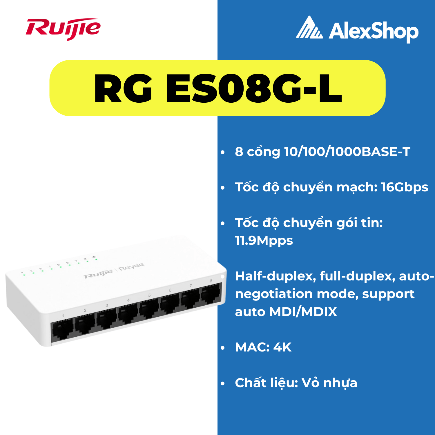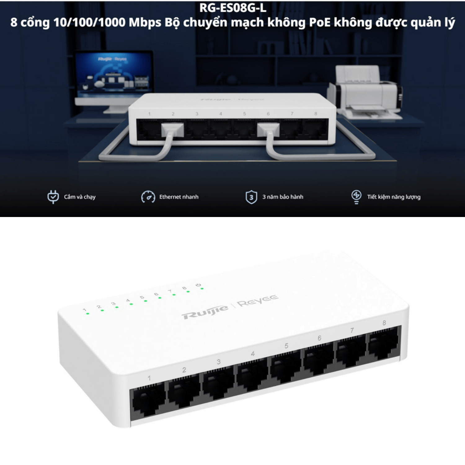 Ruijie RG-ES08G-L – Switch 8 cổng Gigabit, băng thông mạnh mẽ, hoạt động ổn định