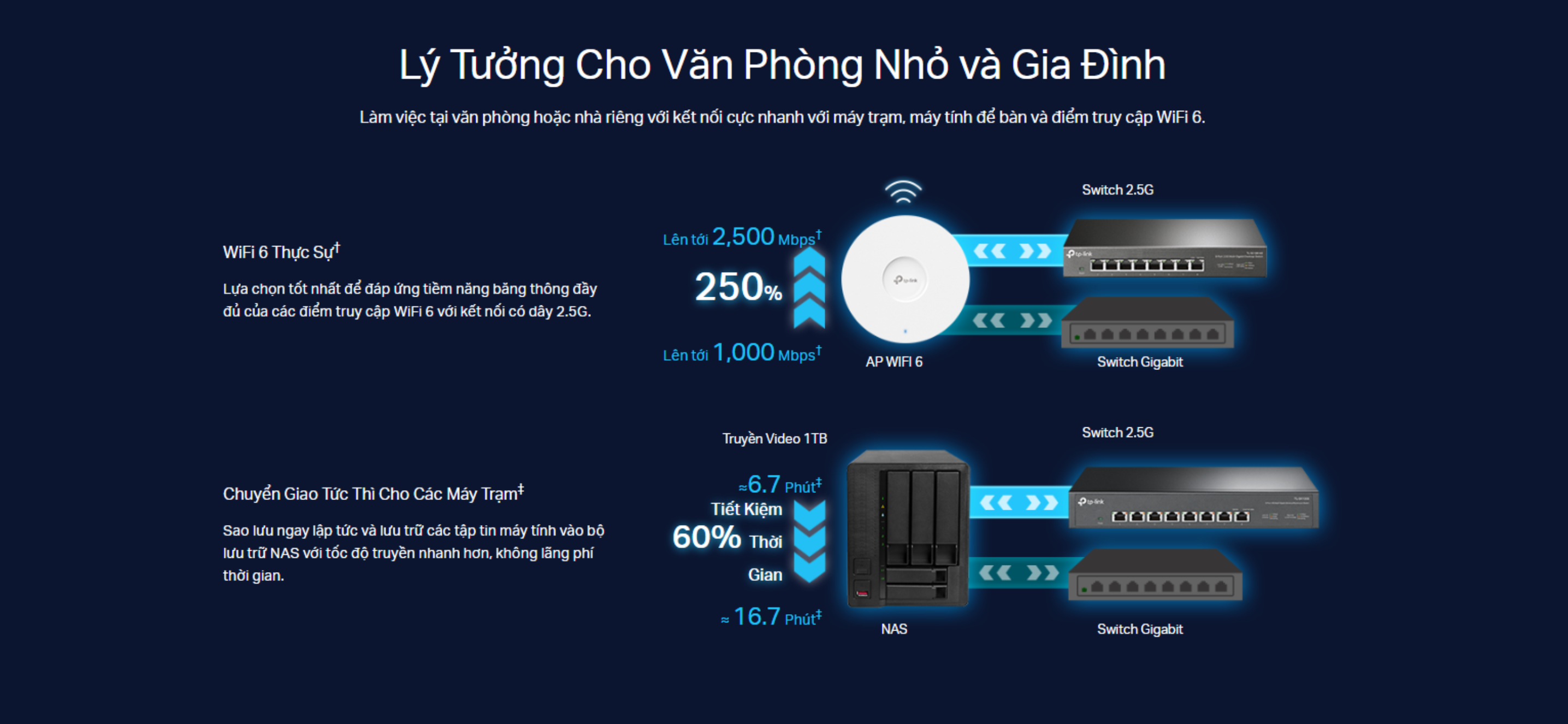 👉 Không Rắc Rối Cáp: Nâng cấp lên 2.5 Gbps ngay lập tức mà không cần nâng cấp lên dây Cat6, giảm chi phí đi dây và rắc rối.