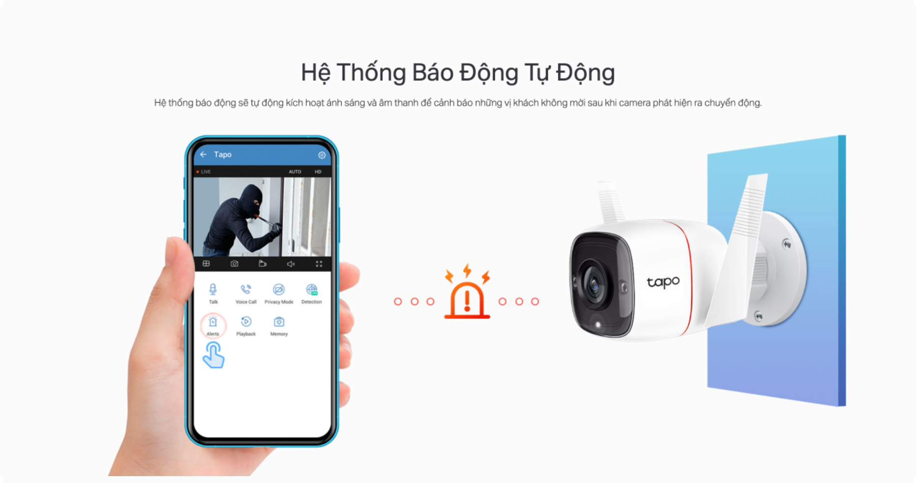 👉 Hệ Thống Báo Động Tự Động: Hệ thống báo động sẽ tự động kích hoạt ánh sáng và âm thanh để cảnh báo những vị khách không mời sau khi camera phát hiện ra chuyển động.
