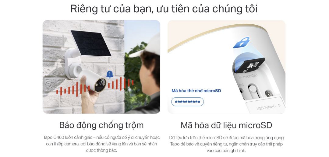 💾 Lưu trữ linh hoạt: Lưu video vào thẻ nhớ microSD (lên đến 512 GB) hoặc sử dụng dịch vụ lưu trữ đám mây Tapo Care.