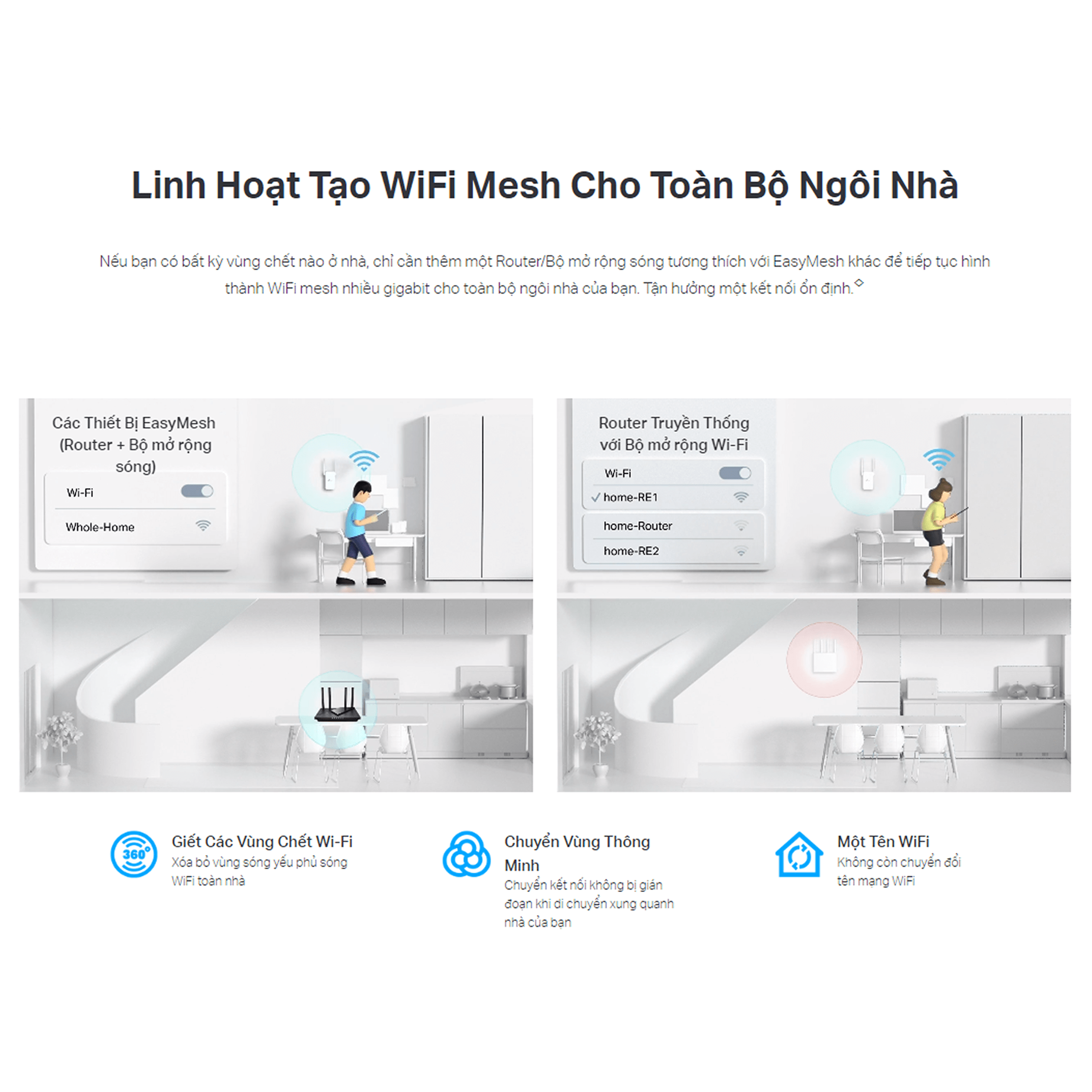 | OneMesh™ | Hỗ trợ OneMesh™ Không cần thay thế các thiết bị hiện có của bạn hoặc mua một hệ sinh thái WiFi hoàn toàn mới, OneMesh ™ giúp bạn tạo một mạng linh hoạt hơn bao phủ toàn bộ ngôi nhà của bạn với các sản phẩm TP-Link OneMesh ™. |