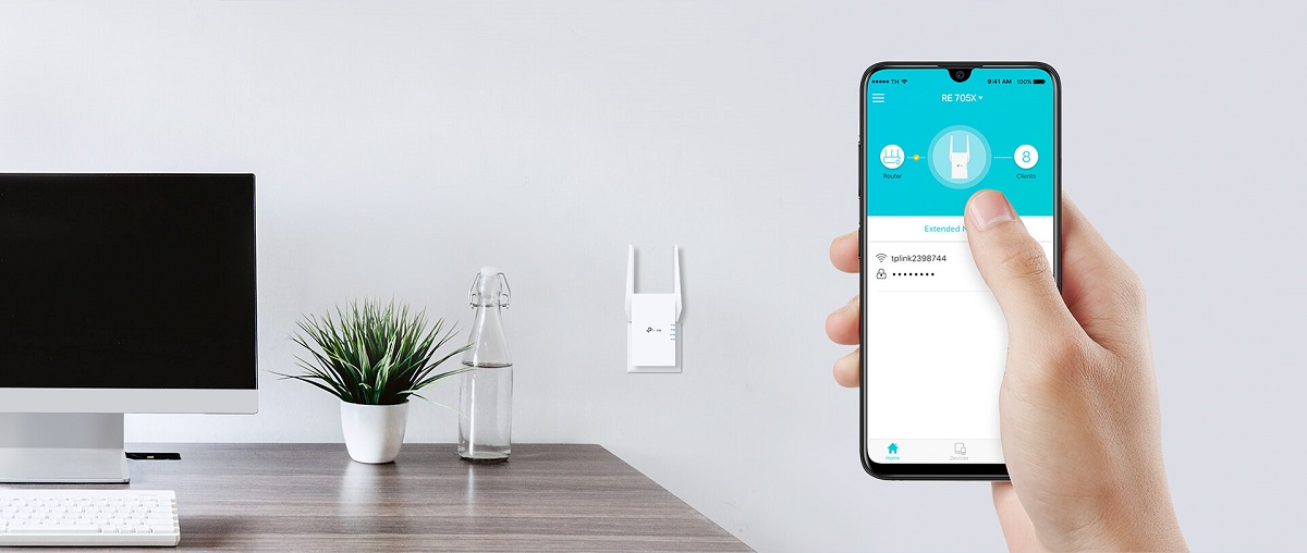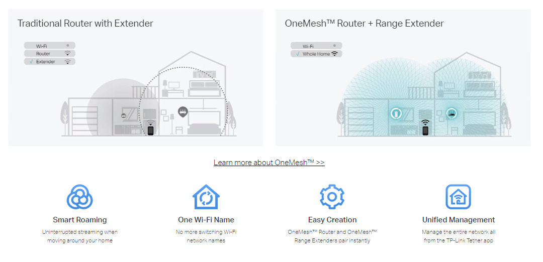 Ngừng tìm kiếm xung quanh cho các thanh đầy đủ. OneMesh™ là một cách đơn giản để tạo thành một mạng Lưới với một tên WiFi duy nhất để phủ sóng toàn bộ ngôi nhà một cách liền mạch. Chỉ cần kết nối RE705X với bộ định tuyến OneMesh™.