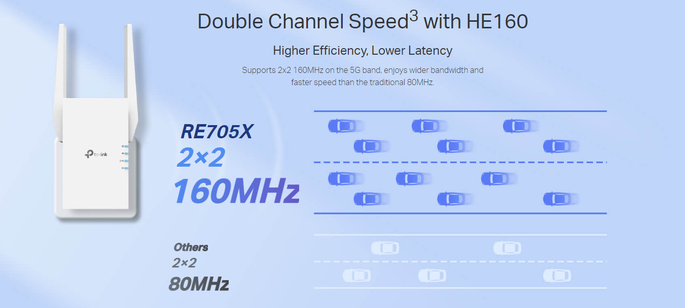 Hỗ trợ 2x2 160MHz trên băng tần 5G, tận hưởng băng thông rộng hơn và tốc độ nhanh hơn 80MHz truyền thống.