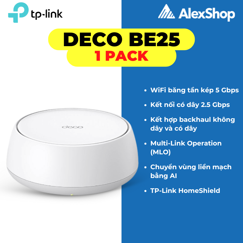 | Nội dung gói | Deco BE25 (gói 3) 3 thiết bị Deco BE25 1 Cáp Ethernet RJ45 3 Bộ đổi nguồn Hướng dẫn cài đặt nhanh Deco BE25 (gói 2) 2 thiết bị Deco BE25 1 Cáp Ethernet RJ45 2 Bộ đổi nguồn Hướng dẫn cài đặt nhanh Deco BE25 (gói 1) 1 thiết bị Deco BE25 1 Cáp Ethernet RJ45 1 Bộ đổi nguồn Hướng dẫn cài đặt nhanh |