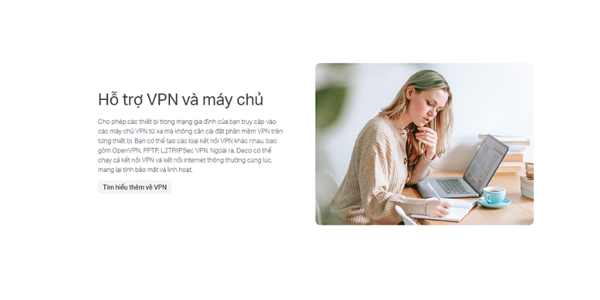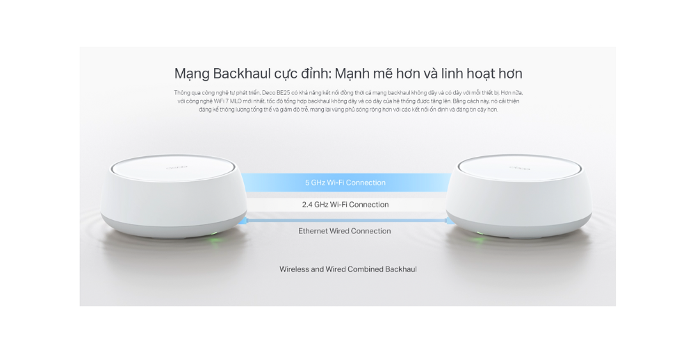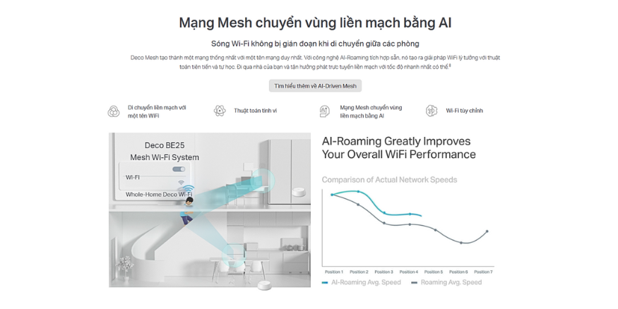 Công nghệ TP-Link Mesh Tùy chọn Ethernet backhaul hoạt động cùng nhau để liên kết các thiết bị Deco nhằm cung cấp vùng phủ sóng liền mạch AI-Driven Mesh Học hỏi môi trường mạng một cách thông minh để cung cấp Wi-Fi lý tưởng, độc đáo cho ngôi nhà của bạn 4 Ăng-ten hiệu suất cao (Bên trong) Nhiều ăng-ten tạo thành một mảng tăng cường tín hiệu để phủ sóng nhiều hướng hơn và diện tích lớn hơn |