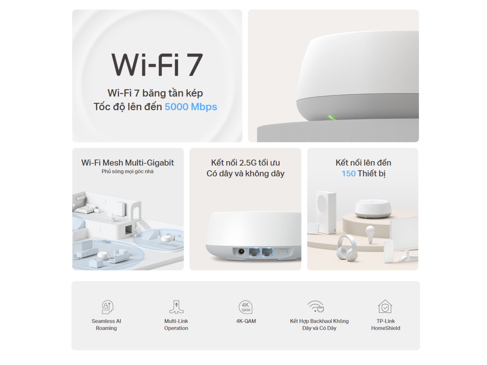 Băng tần kép Phân phối thiết bị đến các băng tần khác nhau để có hiệu suất tối ưu OFDMA Giao tiếp đồng thời với nhiều máy khách WiFi 7 6 Luồng Băng thông đủ cho các thiết bị được kết nối |