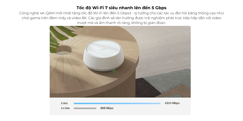 | Tốc độ WiFi | BE5000 5 GHz: 4324 Mbps (802.11be) 2,4 GHz: 688 Mbps (802.11ax) |