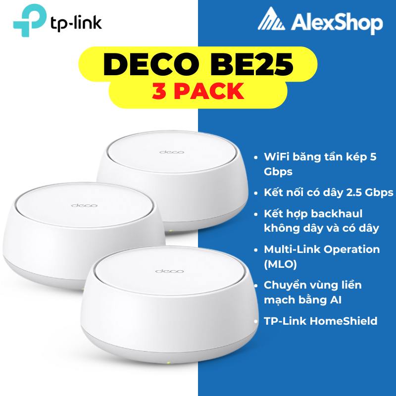 Nội dung gói | Deco BE25 (gói 3) 3 thiết bị Deco BE25 1 Cáp Ethernet RJ45 3 Bộ đổi nguồn Hướng dẫn cài đặt nhanh Deco BE25 (gói 2) 2 thiết bị Deco BE25 1 Cáp Ethernet RJ45 2 Bộ đổi nguồn Hướng dẫn cài đặt nhanh Deco BE25 (gói 1) 1 thiết bị Deco BE25 1 Cáp Ethernet RJ45 1 Bộ đổi nguồn Hướng dẫn cài đặt nhanh |