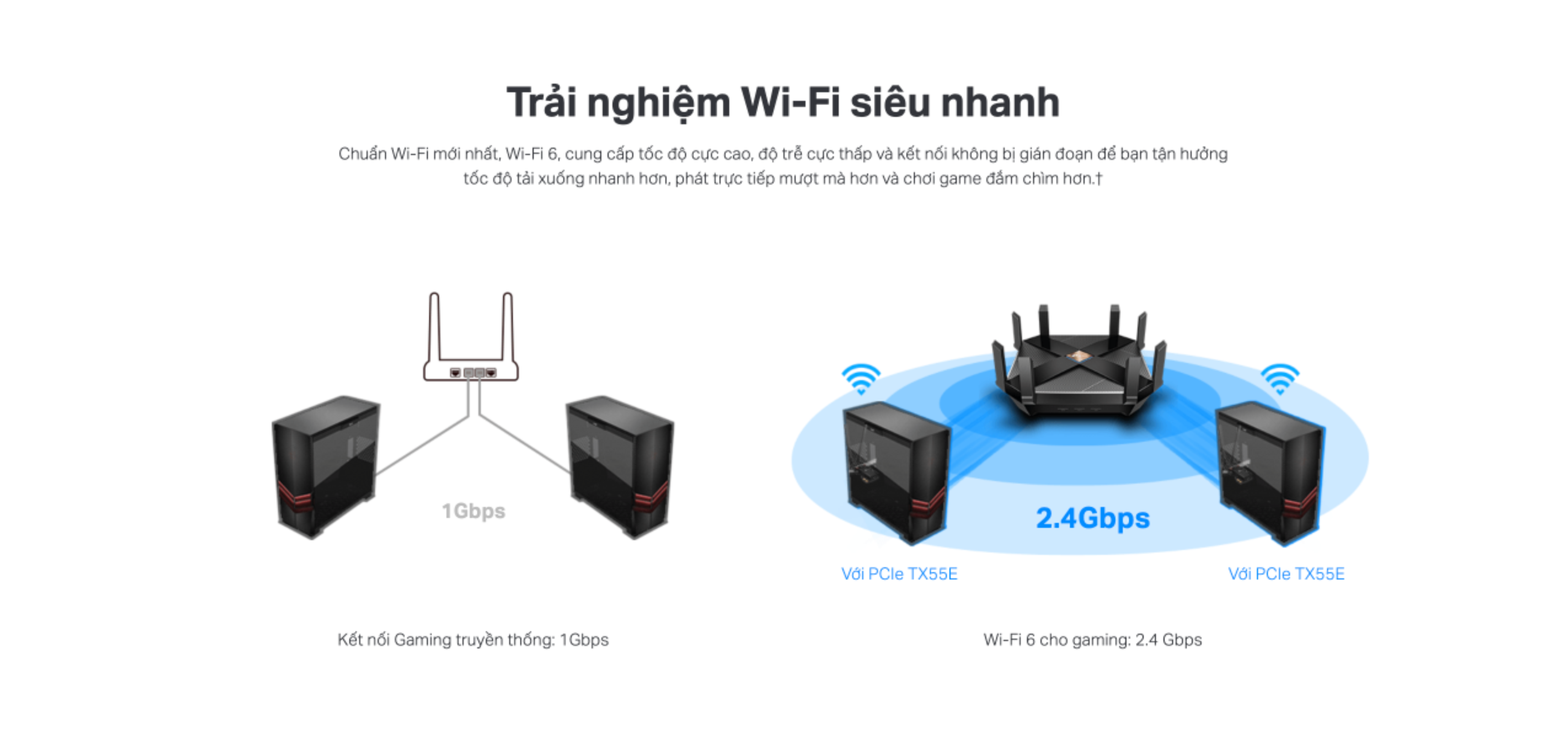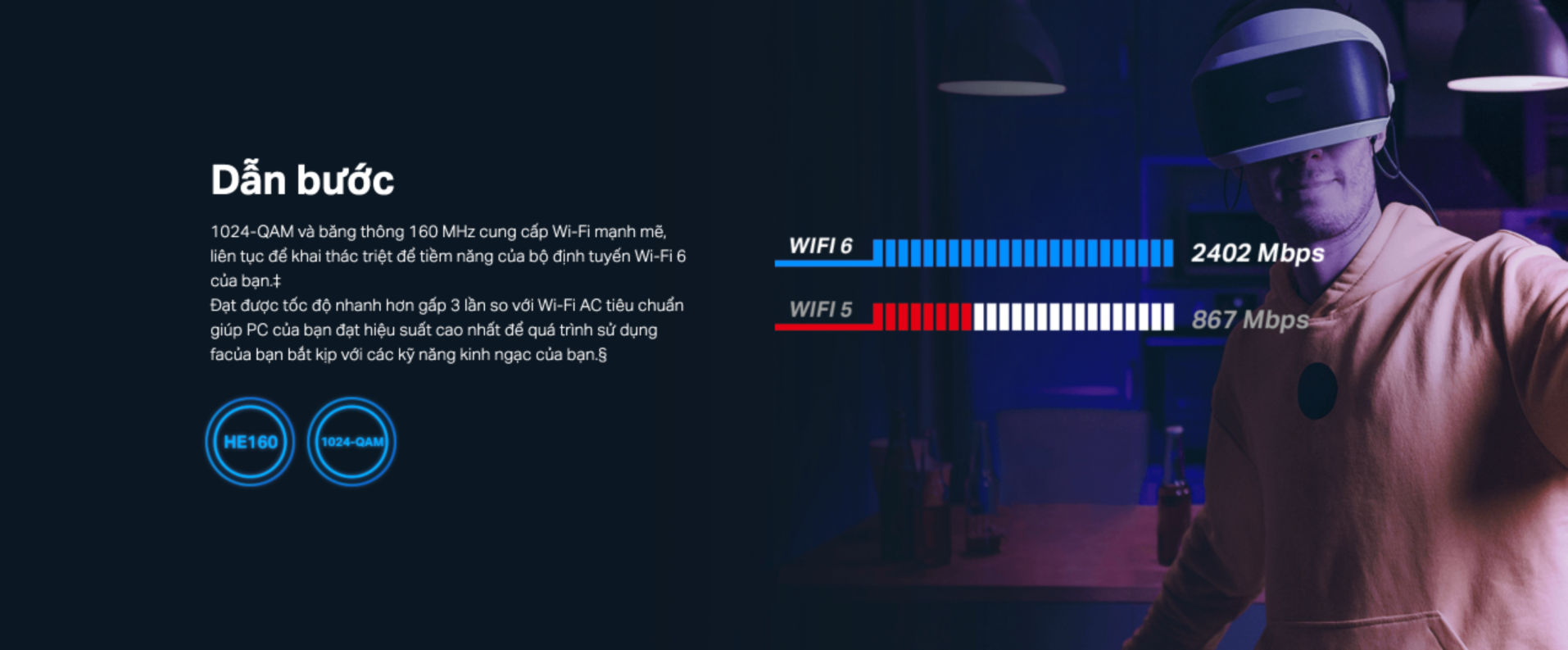 👉 Tốc độ Wi-Fi 6 siêu nhanh—Phá vỡ rào cản gigabit với tốc độ lên tới 2402 Mbps (5 GHz) + 574 Mbps (2,4 GHz)