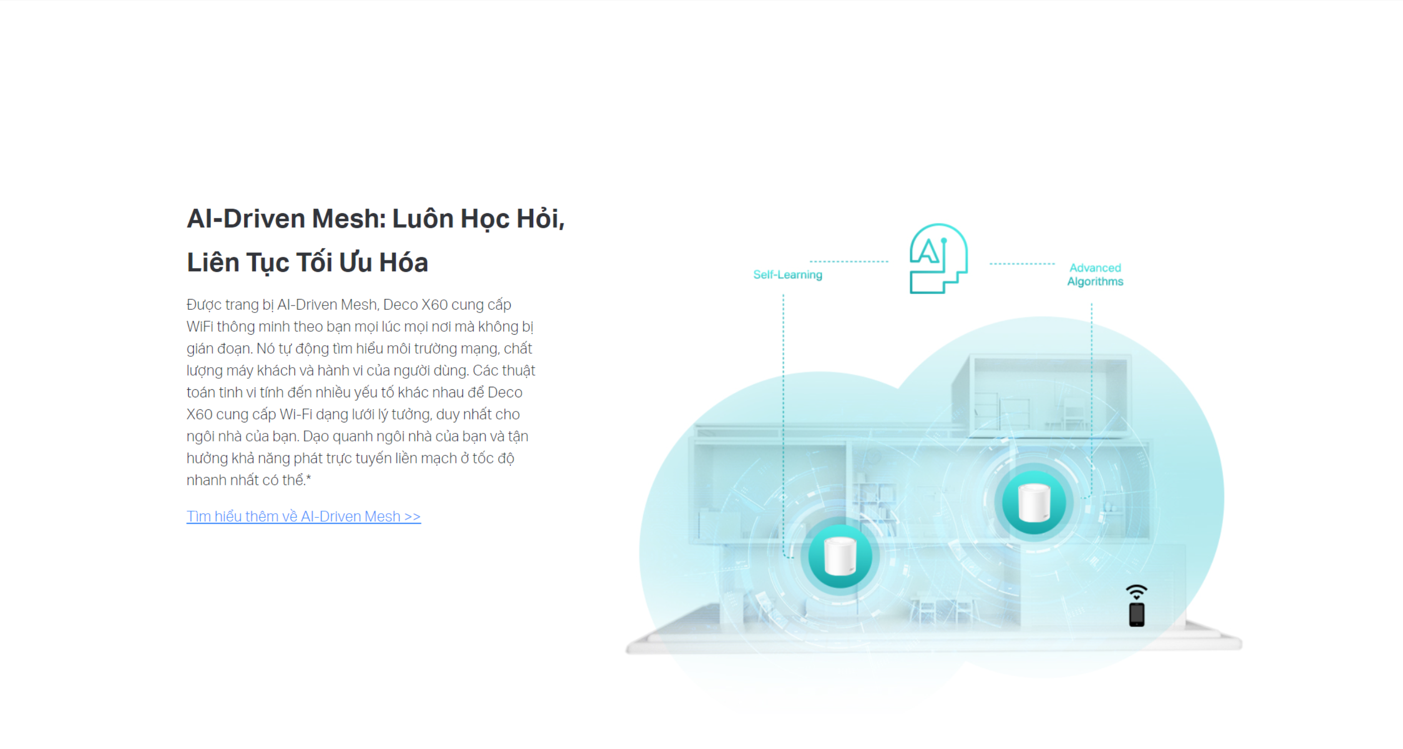 Được trang bị AI-Driven Mesh, Deco X60 cung cấp WiFi thông minh theo bạn mọi lúc mọi nơi mà không bị gián đoạn. Nó tự động tìm hiểu môi trường mạng, chất lượng máy khách và hành vi của người dùng. Các thuật toán tinh vi tính đến nhiều yếu tố khác nhau để Deco X60 cung cấp Wi-Fi dạng lưới lý tưởng, duy nhất cho ngôi nhà của bạn. Dạo quanh ngôi nhà của bạn và tận hưởng khả năng phát trực tuyến liền mạch ở tốc độ nhanh nhất có thể