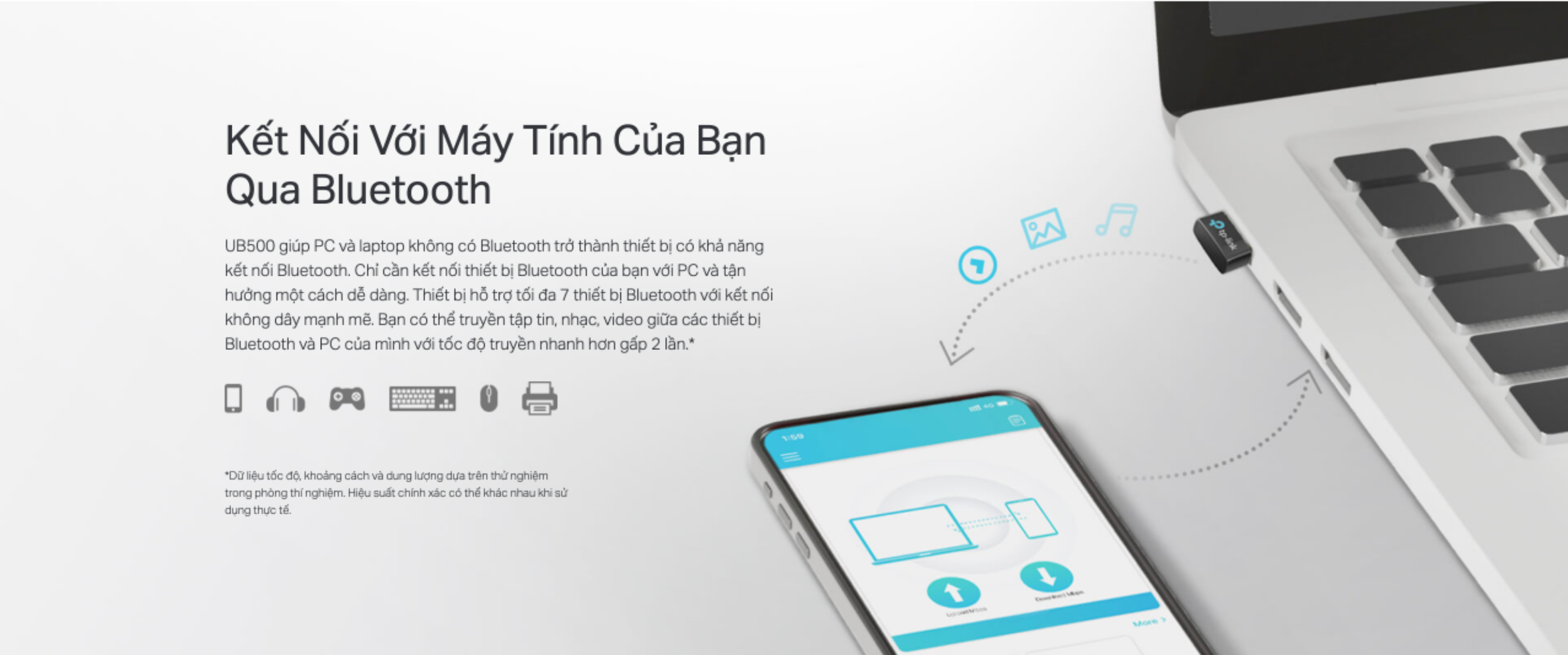 👉 Kết Nối Với Máy Tính Của Bạn Qua Bluetooth: UB500 giúp PC và laptop không có Bluetooth trở thành thiết bị có khả năng kết nối Bluetooth. Chỉ cần kết nối thiết bị Bluetooth của bạn với PC và tận hưởng một cách dễ dàng. Thiết bị hỗ trợ tối đa 7 thiết bị Bluetooth với kết nối không dây mạnh mẽ. Bạn có thể truyền tập tin, nhạc, video giữa các thiết bị Bluetooth và PC của mình với tốc độ truyền nhanh hơn gấp 2 lần.