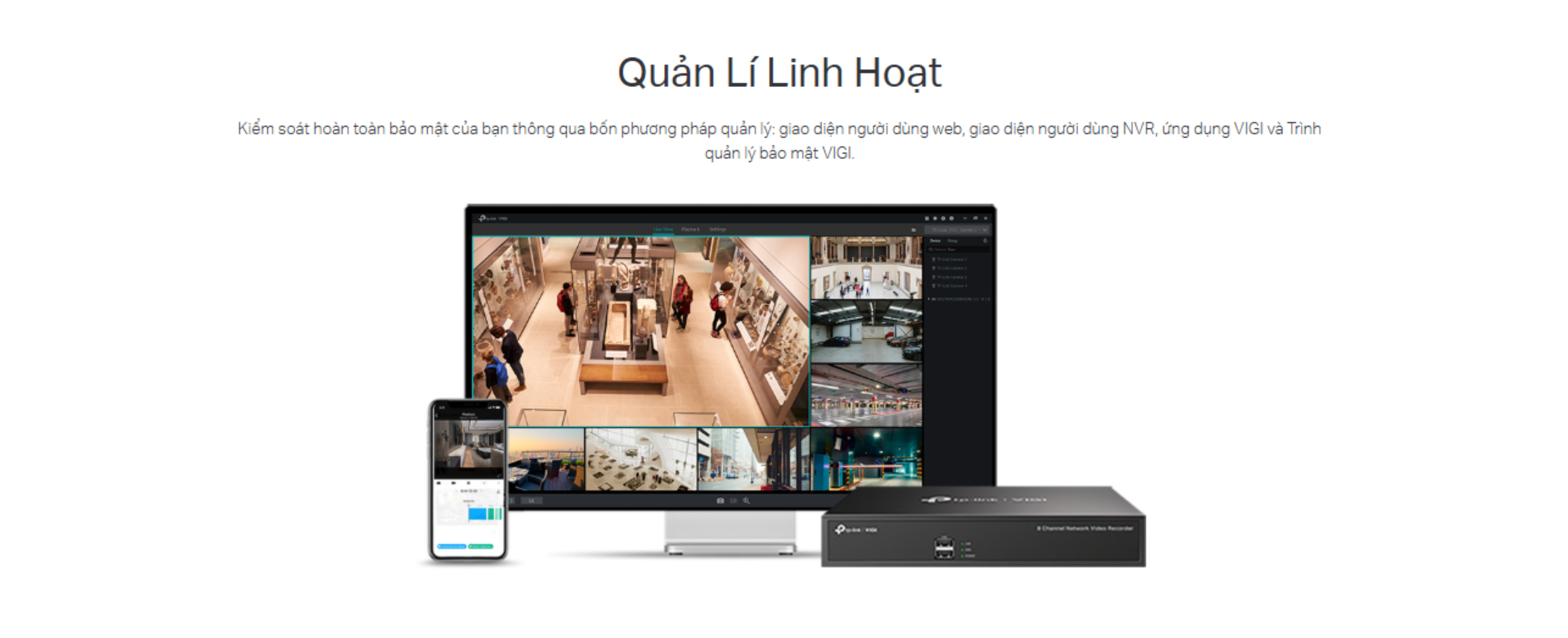 - Quản Lý Linh Hoạt: Kiểm soát hoàn toàn bảo mật của bạn thông qua bốn phương pháp quản lý: giao diện người dùng web, giao diện người dùng NVR, ứng dụng VIGI và Trình quản lý bảo mật VIGI