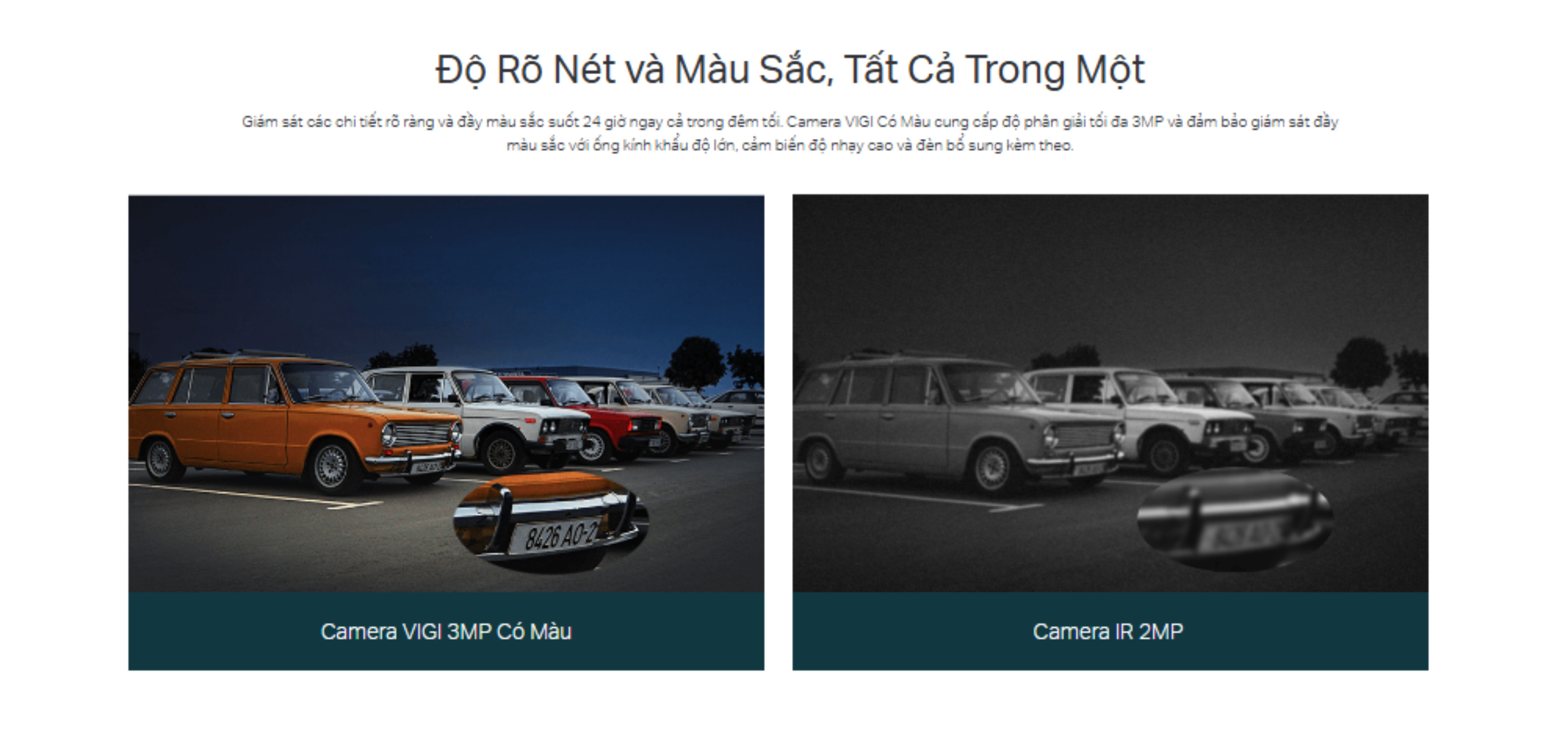 - Có Màu 24h: Thu được chi tiết màu sắc suốt 24 giờ, ngay cả trong điều kiện tối đen như mực, nhờ ống kính khẩu độ lớn, cảm biến độ nhạy cao và đèn bổ sung đi kèm.
