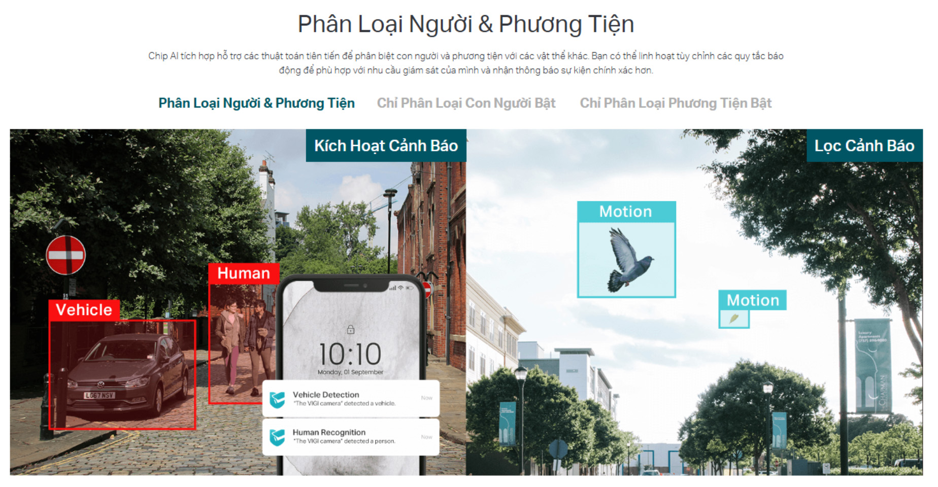 - Phân Loại Người & Phương Tiện: Phân biệt con người và phương tiện với các đối tượng khác để bạn nhận được thông báo sự kiện chính xác hơn.