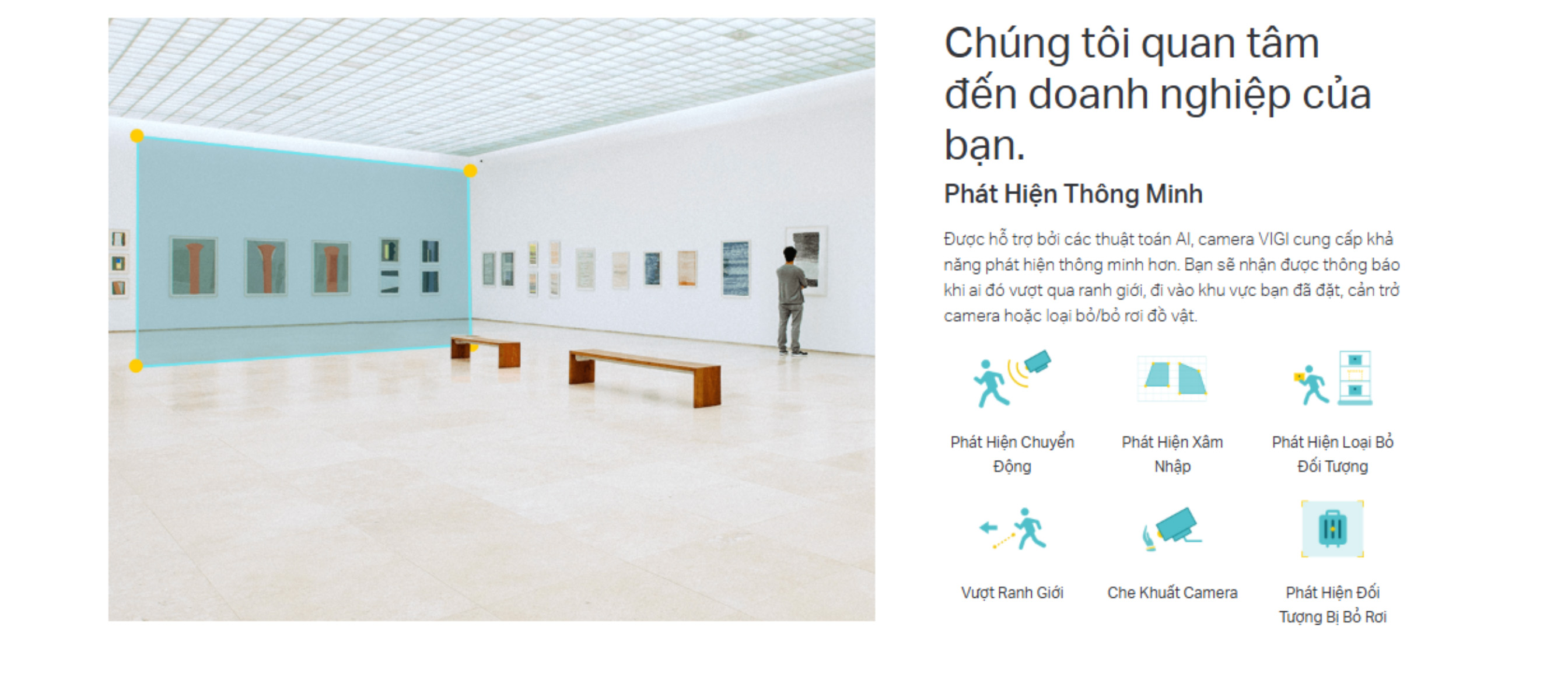 - Phát Hiện Thông Minh: Nhận thông báo và kiểm tra cấp dữ liệu khi ai đó vượt qua ranh giới, đi vào khu vực bạn đã đặt, cản trở camera hoặc xóa/bỏ rơi đồ vật.