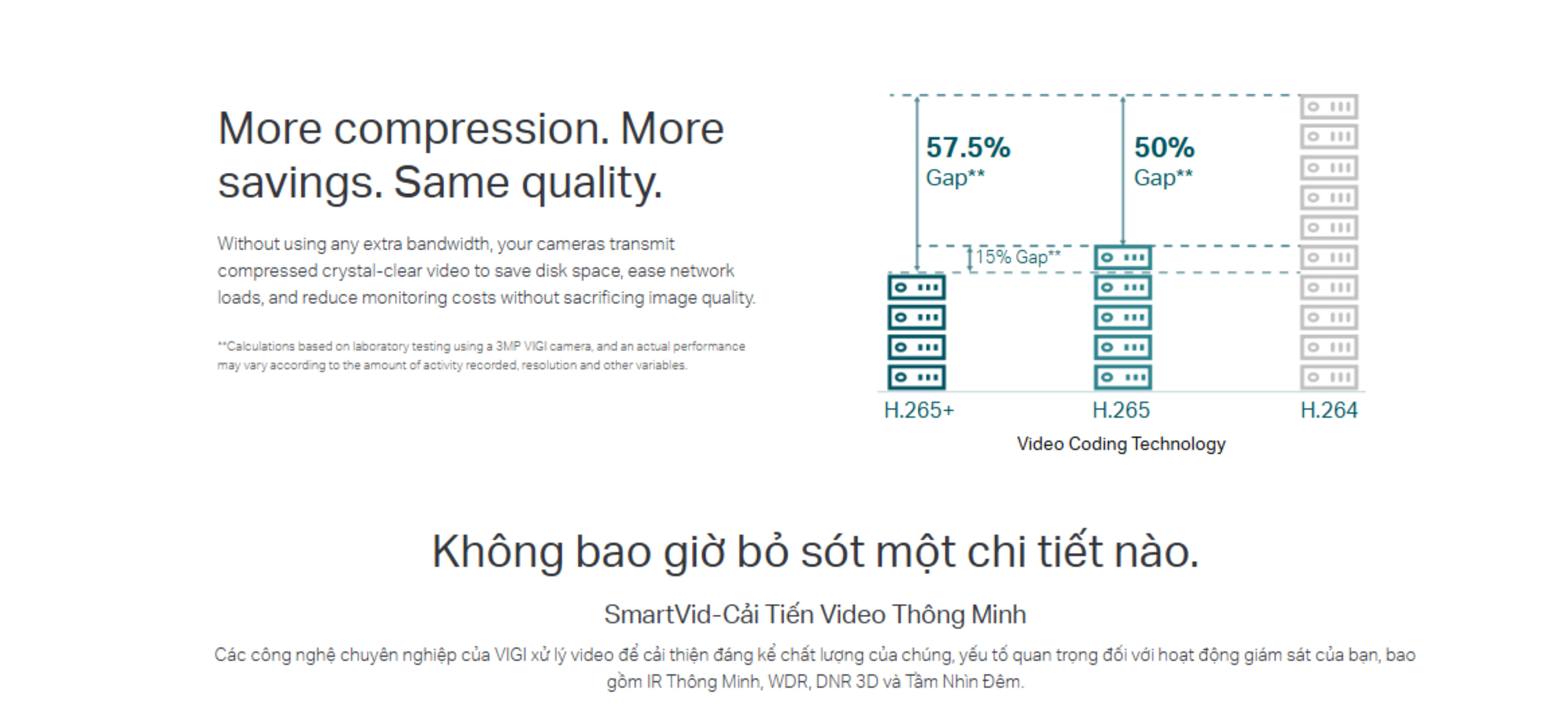 - Cải Tiến Video Thông Minh: Các công nghệ chuyên nghiệp của VIGI xử lý video để cải thiện đáng kể chất lượng của chúng, yếu tố quan trọng đối với hoạt động giám sát của bạn, bao gồm IR Thông Minh, WDR, 3D DNR và Tầm Nhìn Đêm.