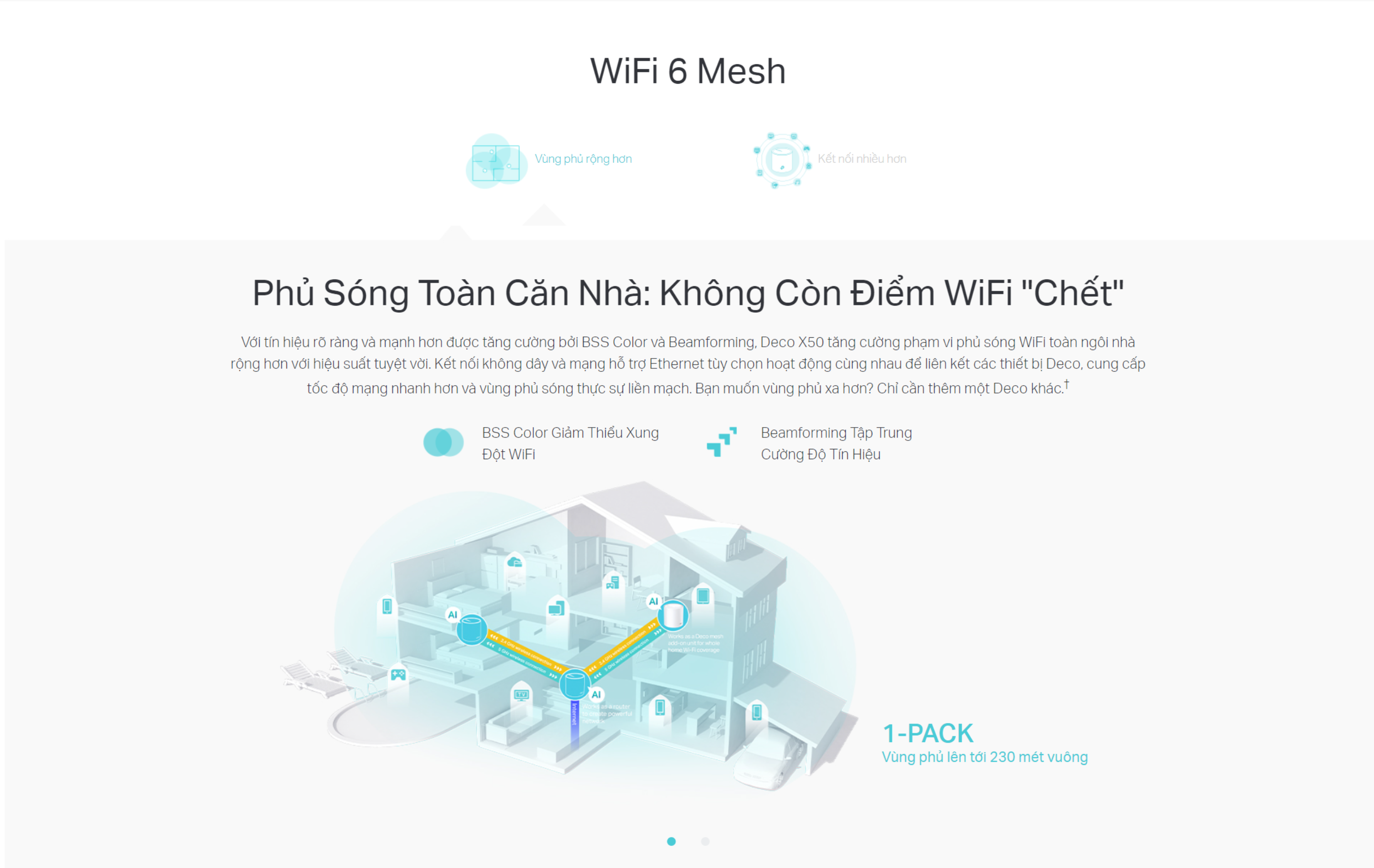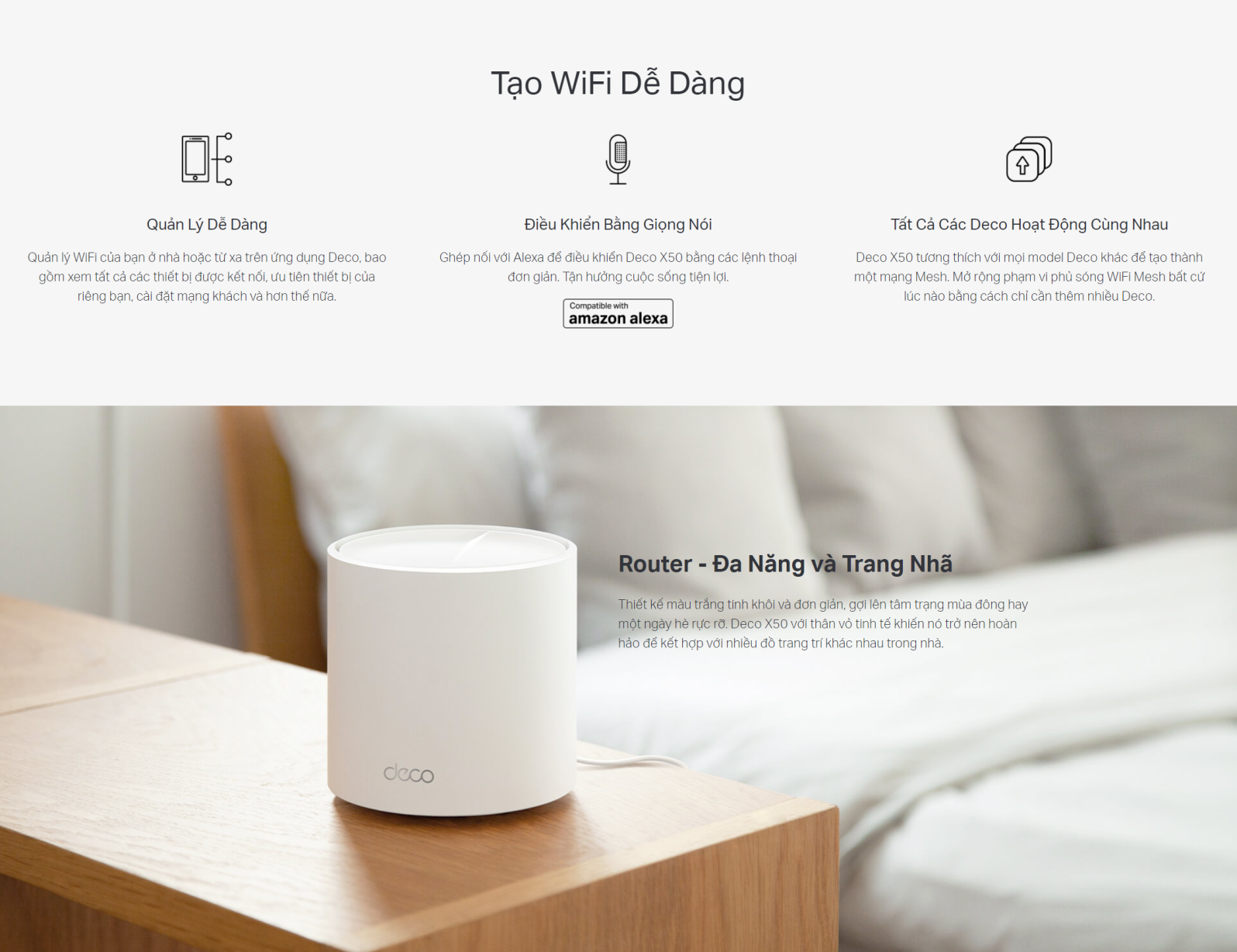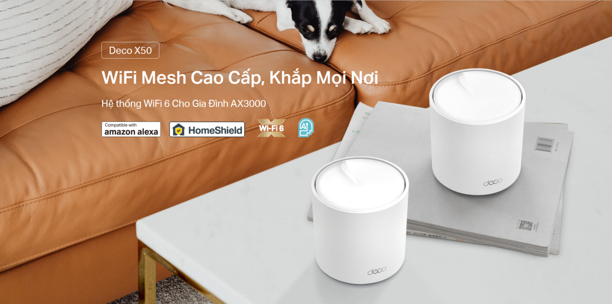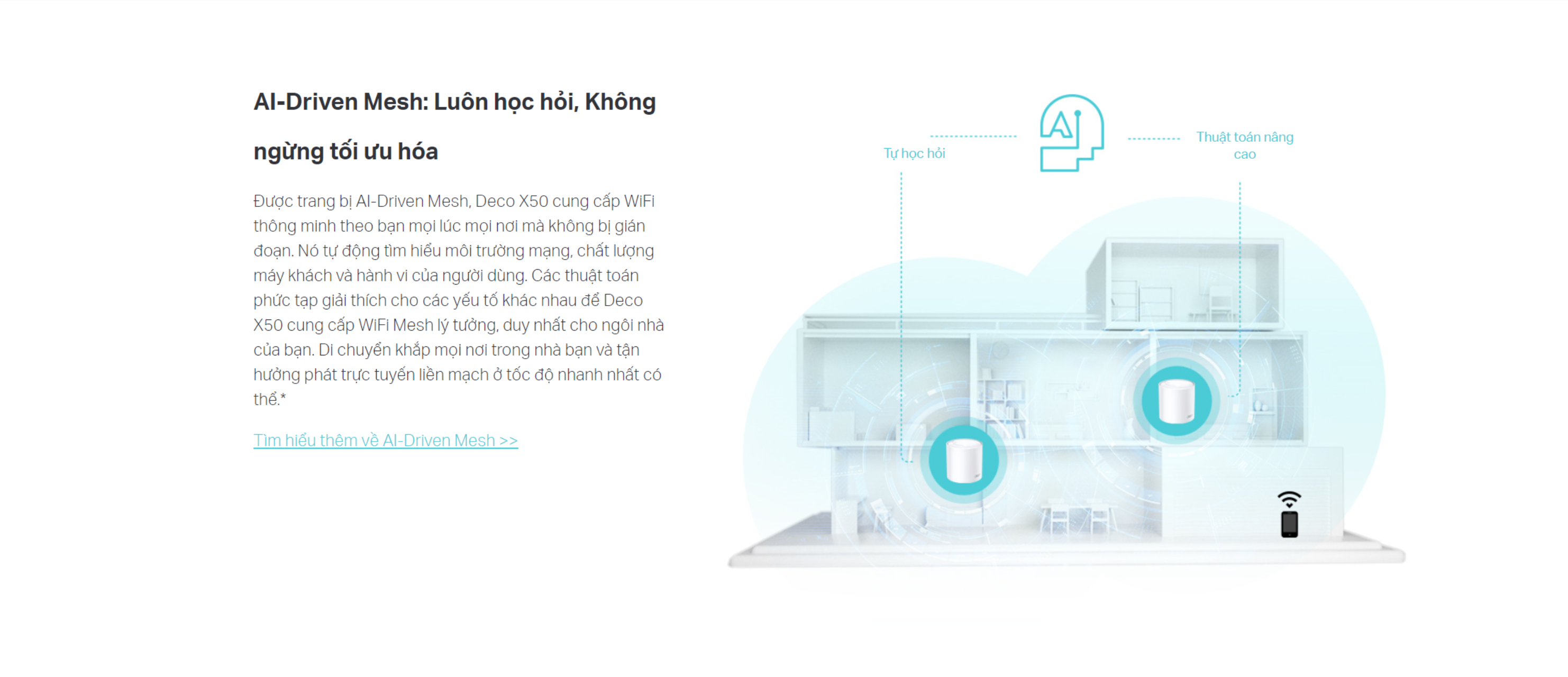 Được trang bị AI-Driven Mesh, Deco X50 cung cấp WiFi thông minh theo bạn mọi lúc mọi nơi mà không bị gián đoạn. Nó tự động tìm hiểu môi trường mạng, chất lượng máy khách và hành vi của người dùng. Các thuật toán phức tạp giải thích cho các yếu tố khác nhau để Deco X50 cung cấp WiFi Mesh lý tưởng, duy nhất cho ngôi nhà của bạn. Di chuyển khắp mọi nơi trong nhà bạn và tận hưởng phát trực tuyến liền mạch ở tốc độ nhanh nhất có thể.