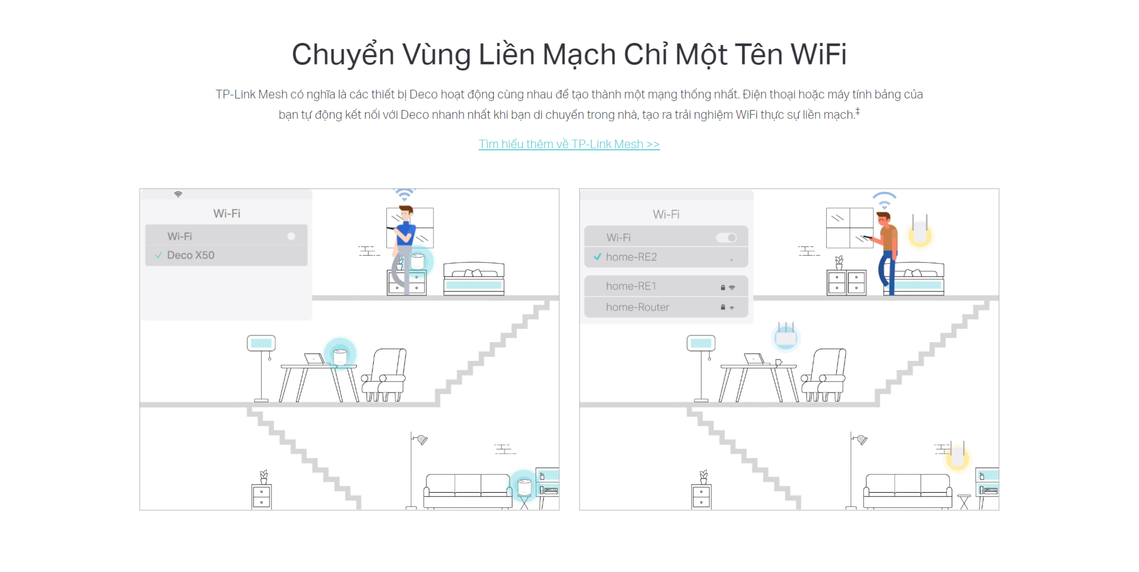 TP-Link Mesh có nghĩa là các thiết bị Deco hoạt động cùng nhau để tạo thành một mạng thống nhất. Điện thoại hoặc máy tính bảng của bạn tự động kết nối với Deco nhanh nhất khi bạn di chuyển trong nhà, tạo ra trải nghiệm WiFi thực sự liền mạch.