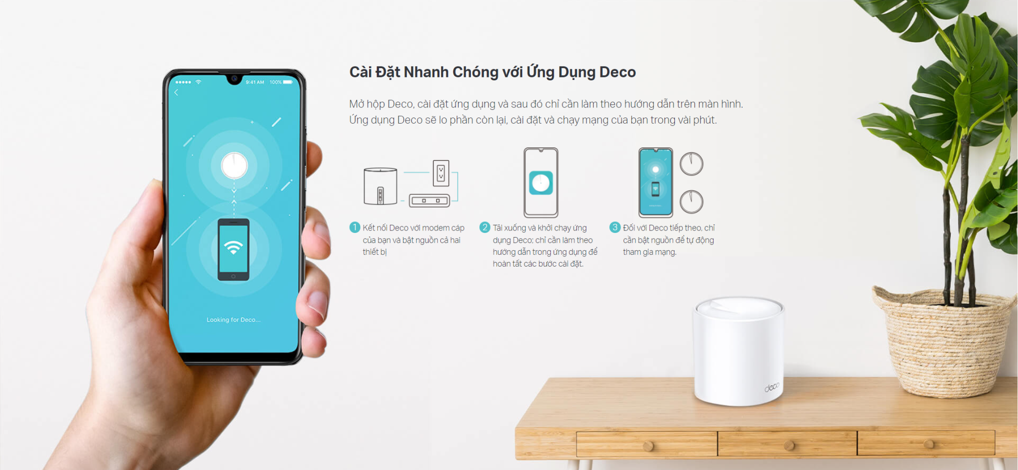 Mở hộp Deco, Deco X50 cài đặt ứng dụng và sau đó chỉ cần làm theo hướng dẫn trên màn hình. Ứng dụng Deco sẽ lo phần còn lại, cài đặt và chạy mạng của bạn trong vài phút.
